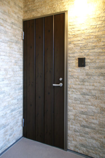 ナチュラルな外壁とよく合う木目調の玄関ドア。