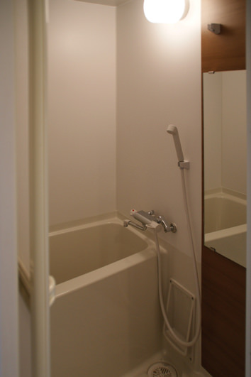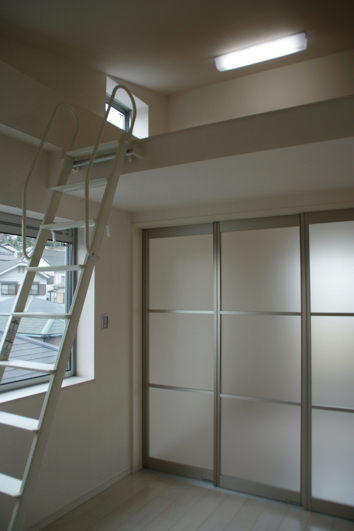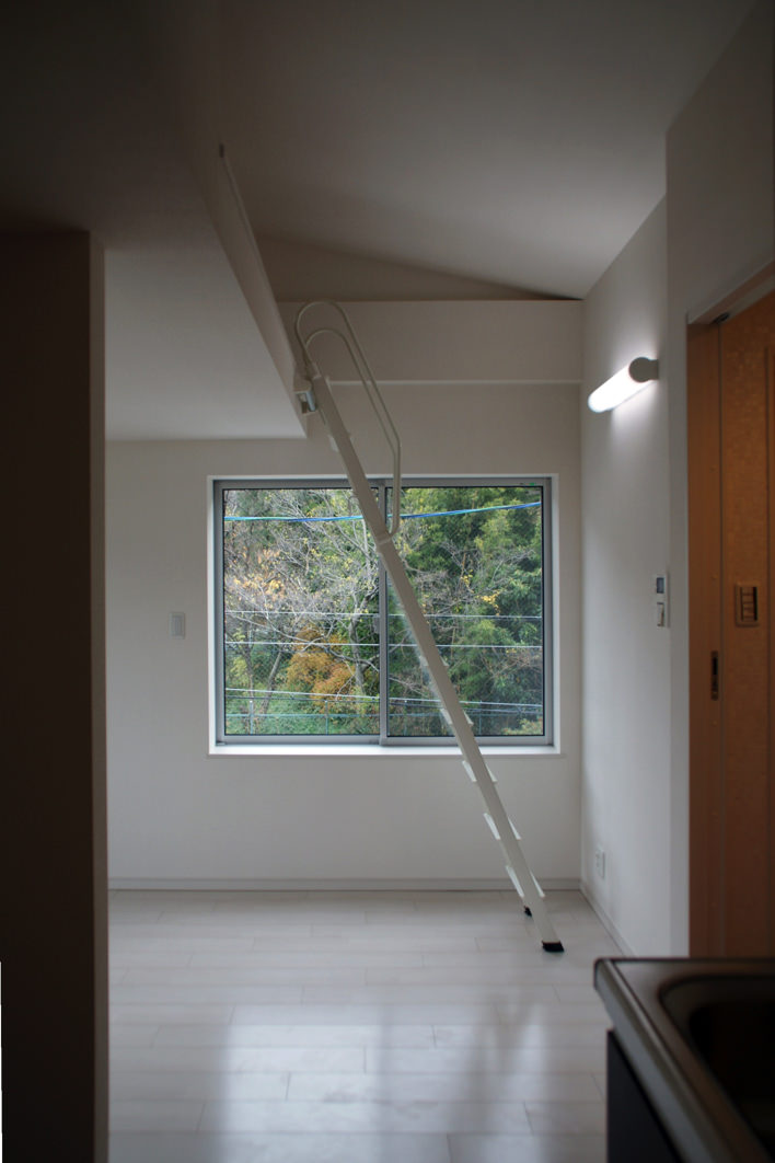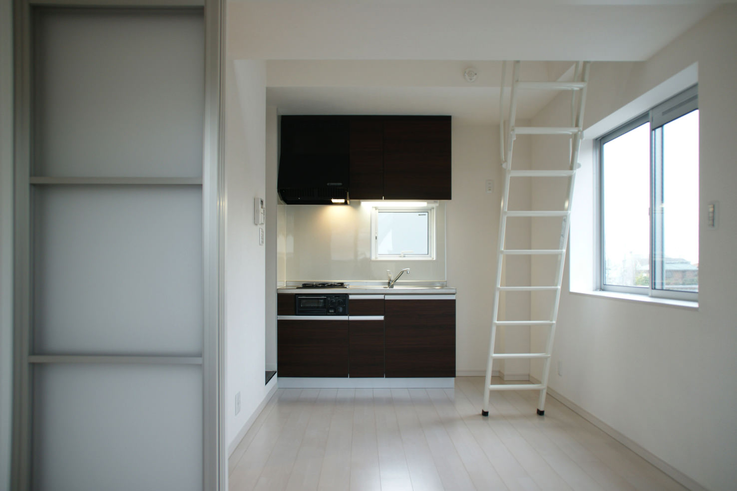 共有スペースの木目調玄関ドアを開ければそこが室内。全戸、コンパクトキッチンやユニットバスはもちろん、トールタイプの玄関収納、独立の洗面台、洗濯スペースも備えた充実仕様です。空間を広々と有効に使うためキッチンはあえて壁付けにし、間仕切りは開放感のある半透明タイプの3枚引戸を採用。さらに、最上階の部屋にはロフトも設けられ、ゆとりを感じる間取りとなっています。 インテリアは白を基調としたシンプルモダンスタイル。コンパクトキッチンのダークな木目カラーがアクセントとなり、空間全体を引き締めています。一人暮らしに必要にして十分な生活機能を、センスの良いデザインでまとめた岡田山共同住宅。その賃貸物件としての評判は高く、完成から間もなく満室になったということです。