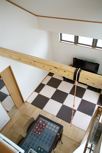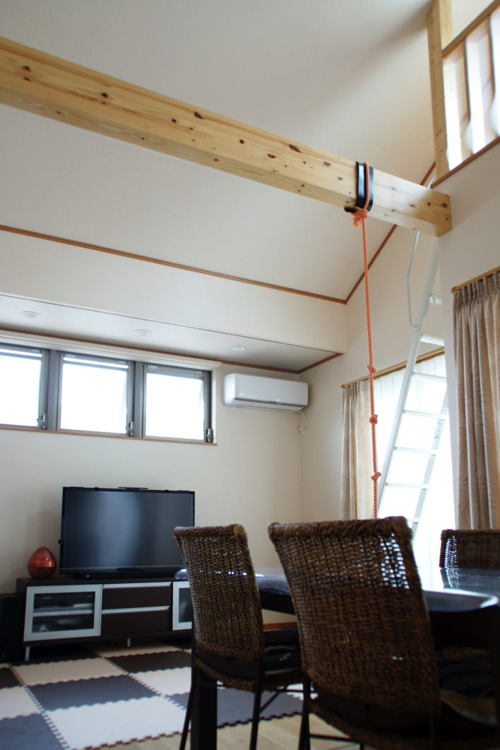 2階は息子様世帯の居住空間です。LDKにお邪魔してまず目を引くのが、頭上に広がる傾斜天井の吹抜け空間とベランダとキッチンの上部を利用した広いロフトスペース。リビングに掛けられたはしごからロフトに昇ると、そこはおもちゃや絵本に囲まれるお子様の絶好の遊び場になっていて、さらに奥には納戸スペースも設けられています。また、ダイニングの上に掛かるしっかりとした梁にはロープがぶら下げられ、お子様の遊具になっていました。それらはまるでフィールドアスレチックのような夢のある雰囲気で、お子様の好奇心や冒険心を育んでいるように思えました。