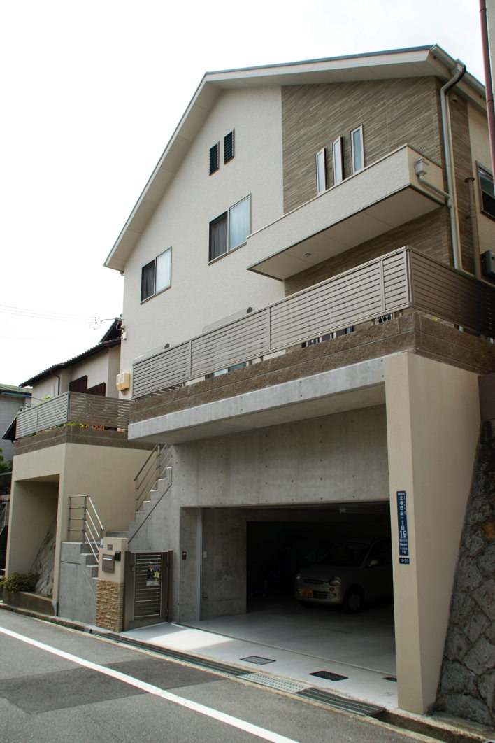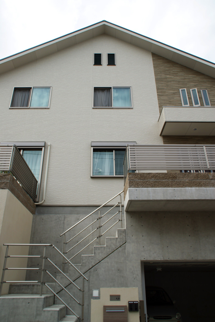 建物は、擁壁を切り取りRC造のガレージを設け、その上に木造2階建て住宅が建つ構成。一見3階建てに見えるほど、高さを感じる立派な外観です。ガレージは2台の車が余裕を持って停められるスペースを確保し、奥には倉庫も設けられています。