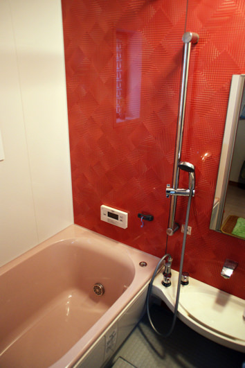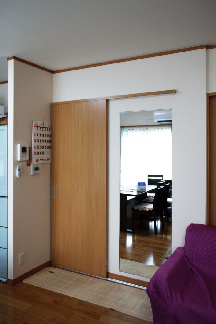 この空間で印象に残ったのは、水回りにスペースにつながる引戸の控え壁に大きな姿見が取り付けられていたことです。これは、引戸との干渉をさけて鏡を壁に埋め込むという一手間かけて施工されたものですが、それでもあえて希望されたのは、お母様がこれまで洋服店を営まれ、洋裁の仕事をされる中で常に姿見のある生活を送られてきたことによります。仕事を辞められた今でも、全身を映す鏡は近くになくてはならないこだわりのアイテムなのです。