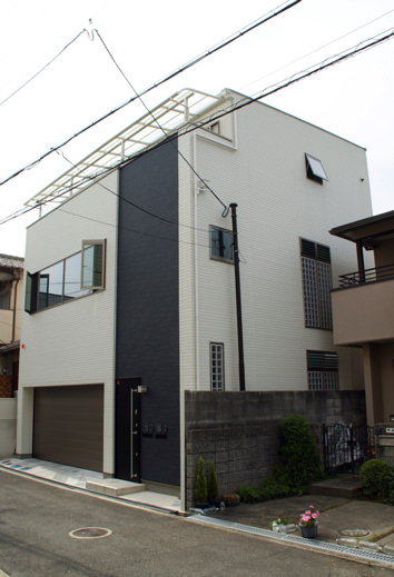前面の道路からT様邸を眺めると、それは一見モダンなイメージにまとめられた3階建の一戸建住宅です。しかし、そこには秘密がありました。新しい建物の奥に、ご主人のお母様が建てられた平屋の住宅がつながって存在していたのです。