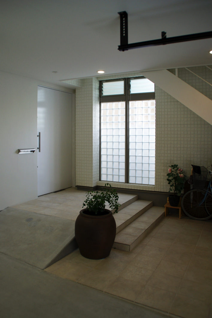1階の道路に面した玄関ドアを開けると家の中かと思いきや、そこはガレージの一角で階段の昇り口がありました。そう、そこはまだアプローチなのです。壁面のガラスブロックから光が入る階段を上がると、今度は正真正銘の玄関が出迎えてくれました。この玄関には向かって右手に間接照明で演出された大型玄関収納があり、正面には空間を広く見せるミラー扉の収納スペースも設けられています。これらの収納量の多さはご家族の満足されているポイントの一つだということです。