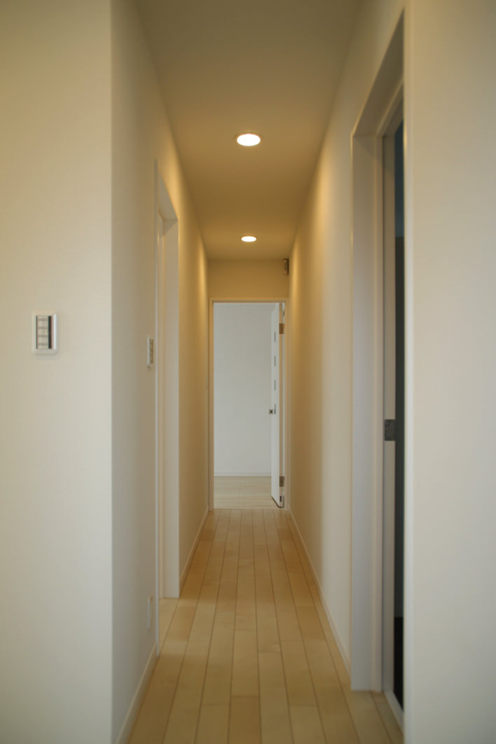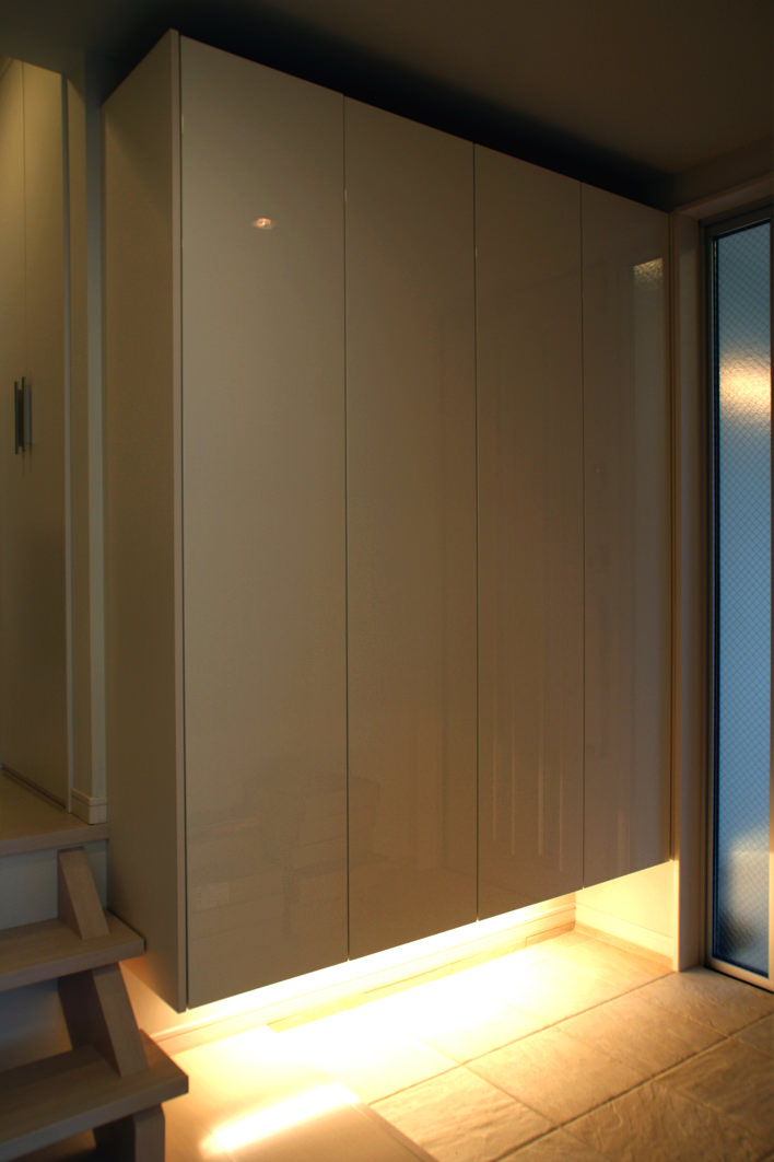 2階の玄関に設けられた大型の玄関収納。足下の間接照明が空間を演出。