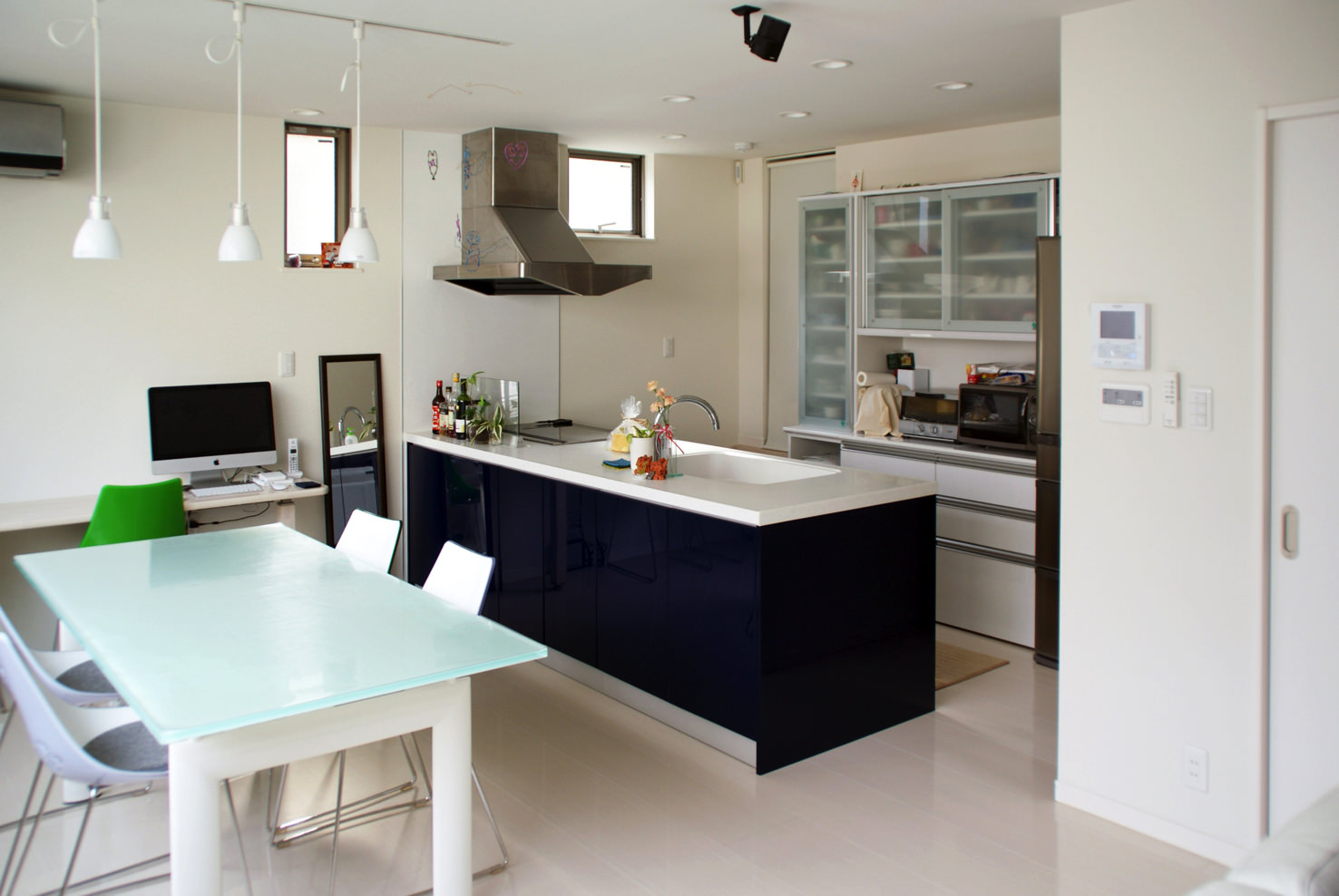 T様邸のインテリアは、全体的に白を基調としたモダン空間で、家の要所要所にアクセントとなるカラーや「エコカラット」といった内装材を用いて表情を演出しているのが特徴です。その最も印象的なのは、LDK空間におけるキッチンのダークブルーの鏡面扉です。LDKは2階の南面に位置しており、大きな窓から入る光が室内に広がりますが、その中でダークブルーのキッチンがインテリアを引き締め、一際存在感を放っているように見えました。この、オープンスタイルの対面カウンタータイプのキッチンは、奥様のご要望をカタチにしたものです。ちなみに、ご夫婦にヨークベルの印象をお聞きしたところ、「とても相談しやすく細かな要望も聞いてもらえ、悩みにも気長につきあってもらえた」と、満足のコメントをいただきました。