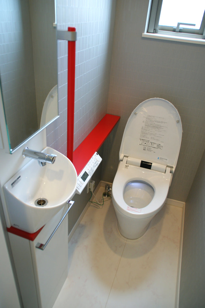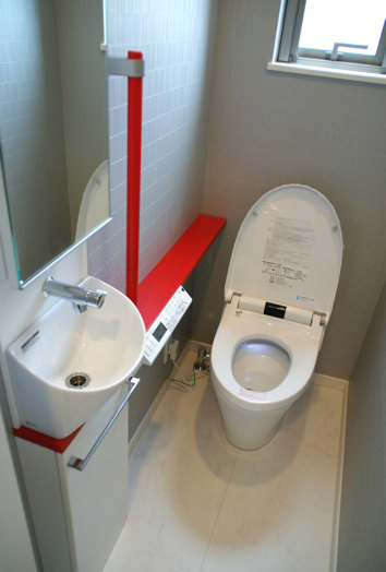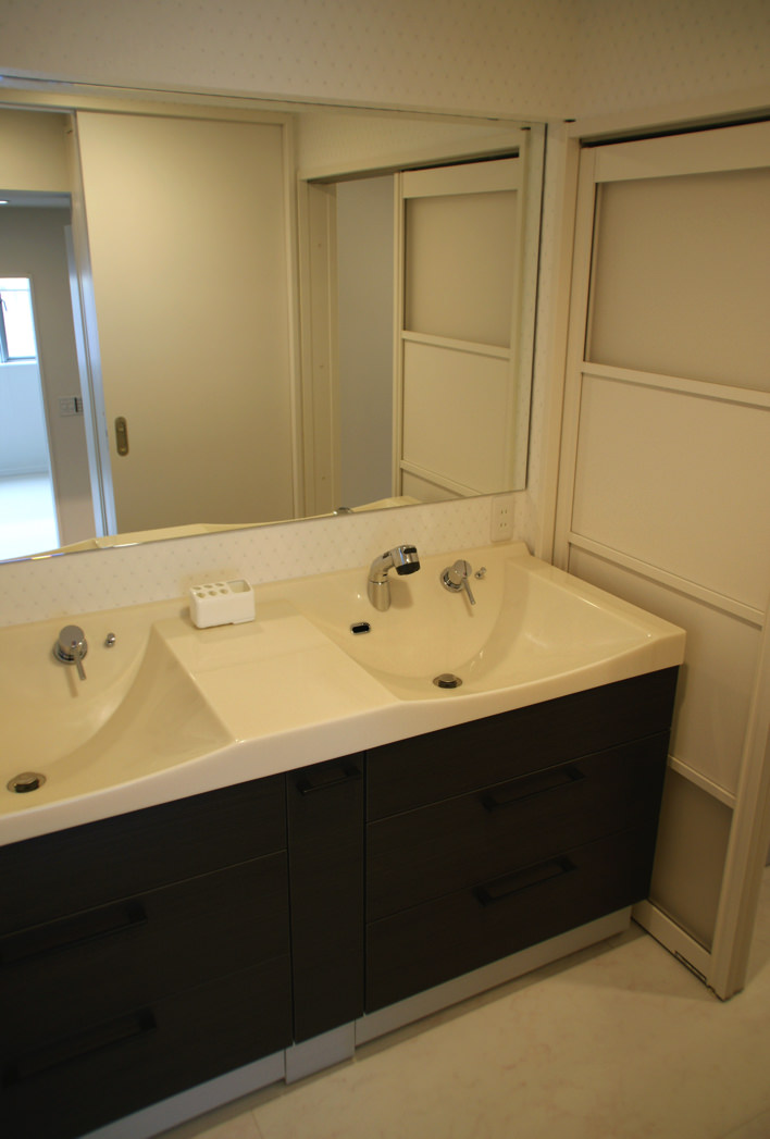 ご家族のご要望をカタチにしたもう一つの特徴的な例が、ツインボールの洗面化粧台と洗面室から独立した脱衣室です。年頃のお嬢様が2人いらっしゃるご家族ならではのニーズでしたが、冒頭に説明した既存の建物の上に持ち出す形状の設計にした結果、ゆとりの水回りスペースが実現しました。