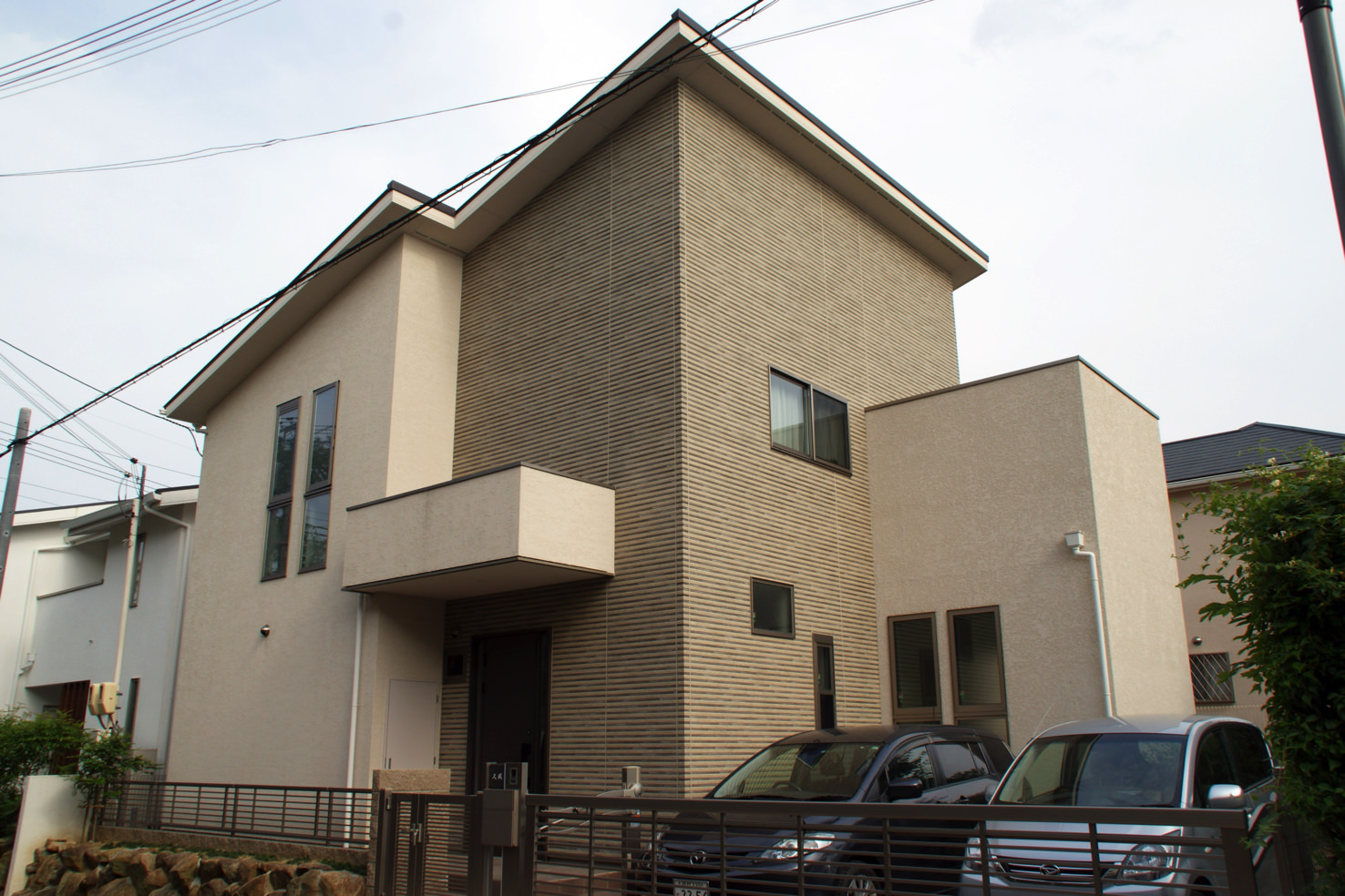 K様邸は、ベージュ系で色合いを統一したシックで落ち着きのある外観です。タイル調サイディングと塗り壁を組み合わせた外壁は質感の高い表情を演出し、閑静な町並みに調和しています。