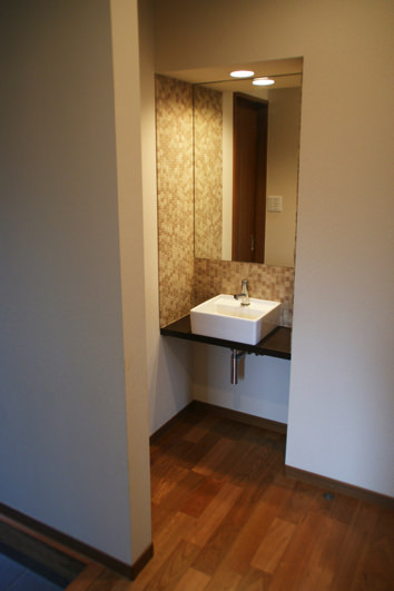 玄関は、通常使う側とシューズクローク側、どちらからでも家に上がれる2WAYタイプ。シューズクロークに通じるドアを閉めると、すっきりとした印象の玄関ホールになります。特徴的な点は、その空間の一角に手洗いが設けられているということ。これは、お客様が気兼ねなく使える洗面台としてご主人が要望されたものです。モザイク調タイルが貼られた壁とオシャレなボウルがライトで照らし出され、機能的であると同時に玄関空間の粋なアクセントになっていました。