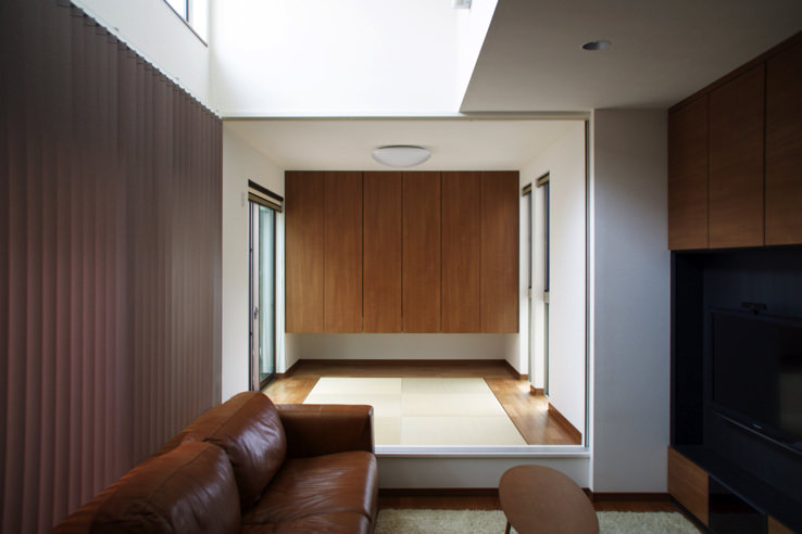 和室と一体化したリビングルーム。下にヌケのある収納が現代的な和の趣を演出。