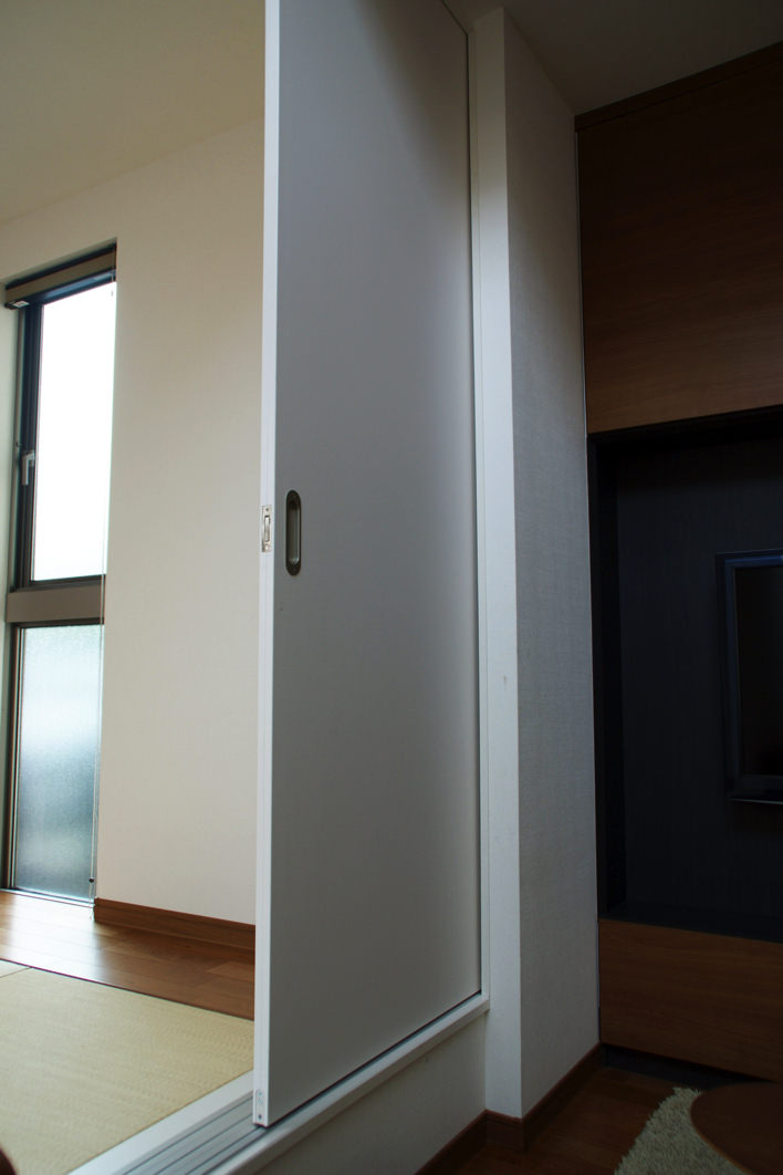 和室の境には間仕切り引戸をインセット(控え壁を造作)。