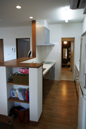 水回りは、キッチンと洗面脱衣室がつながった効率的な家事動線のプランです。キッチンはリビングと対面にレイアウトされているので、遊び盛りのお子様に目配りができることが、奥様のお気に入りのポイントだということでした。