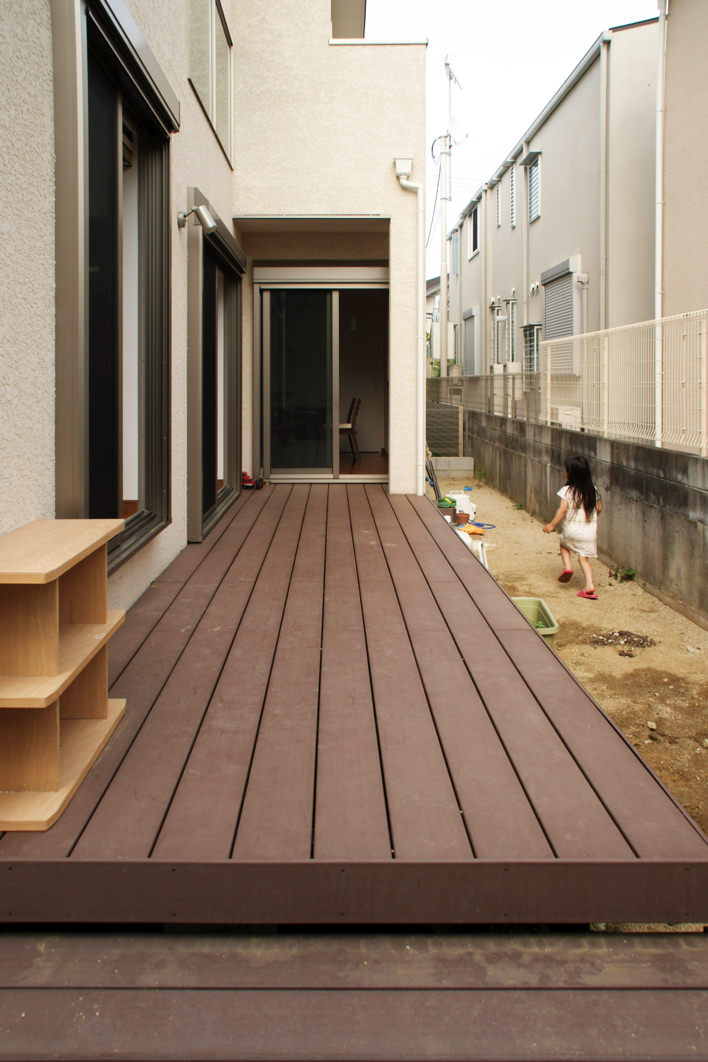 リビングの南側には広々したデッキスペースが設けられ、お子様の遊び場になっています。建物をL 型に配置し、それによって生まれたスペースをデッキにする設計は、光がふんだんに取り入れられ建坪以上のゆとりイメージが得られるという点でご主人がとくに満足されているポイントです。しかし、建設業者選定前のプラン検討で、このアイデアに対応したのはヨークベルだけだったということです。「プランとコストの柔軟な対応力」‥この点もヨークベルをお選びいただいた理由の一つのようです。
