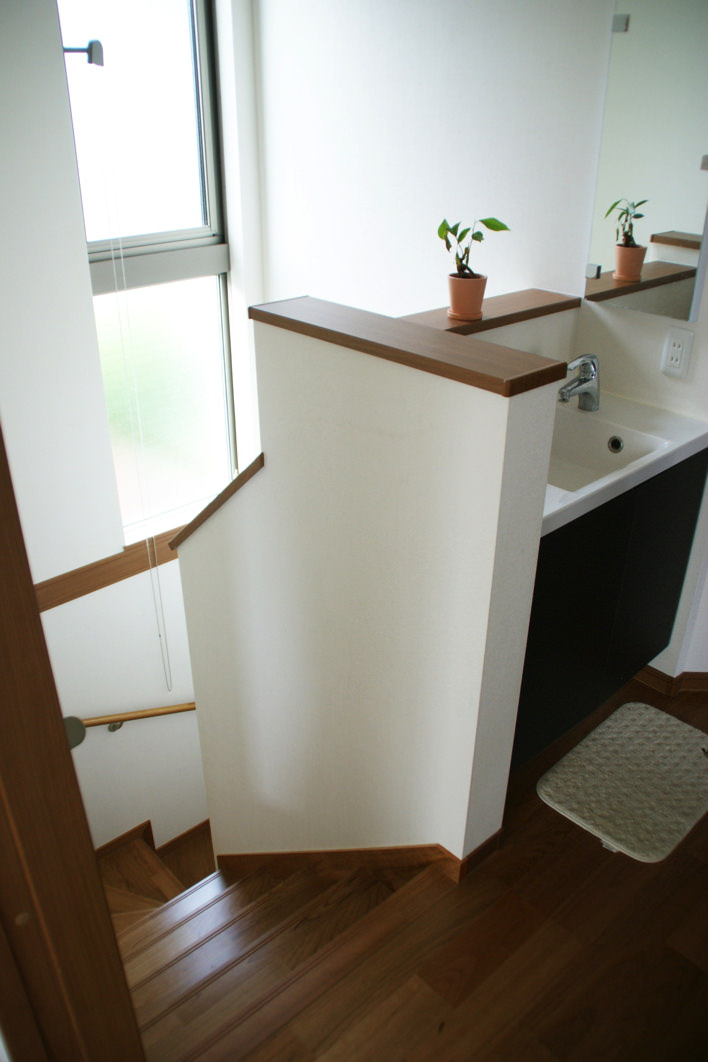 既製品を上手に使い、階段ホールの限られたスペースに洗面台を設置。