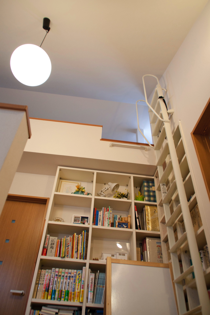 ご主人様が勝ち得た!?ファミリースペースは、2階の階段を上がった場所にあります。そこは傾斜天井で意図した通り開放感があり、広々としたロフトと一体化しています。また壁面には背の高い書棚が据え付けられ、さながら図書室といった感じでした。お嬢様たちがこれから成長される上で、この豊かなスペースはとても良い影響を与えるだろうと直感的に思いました。