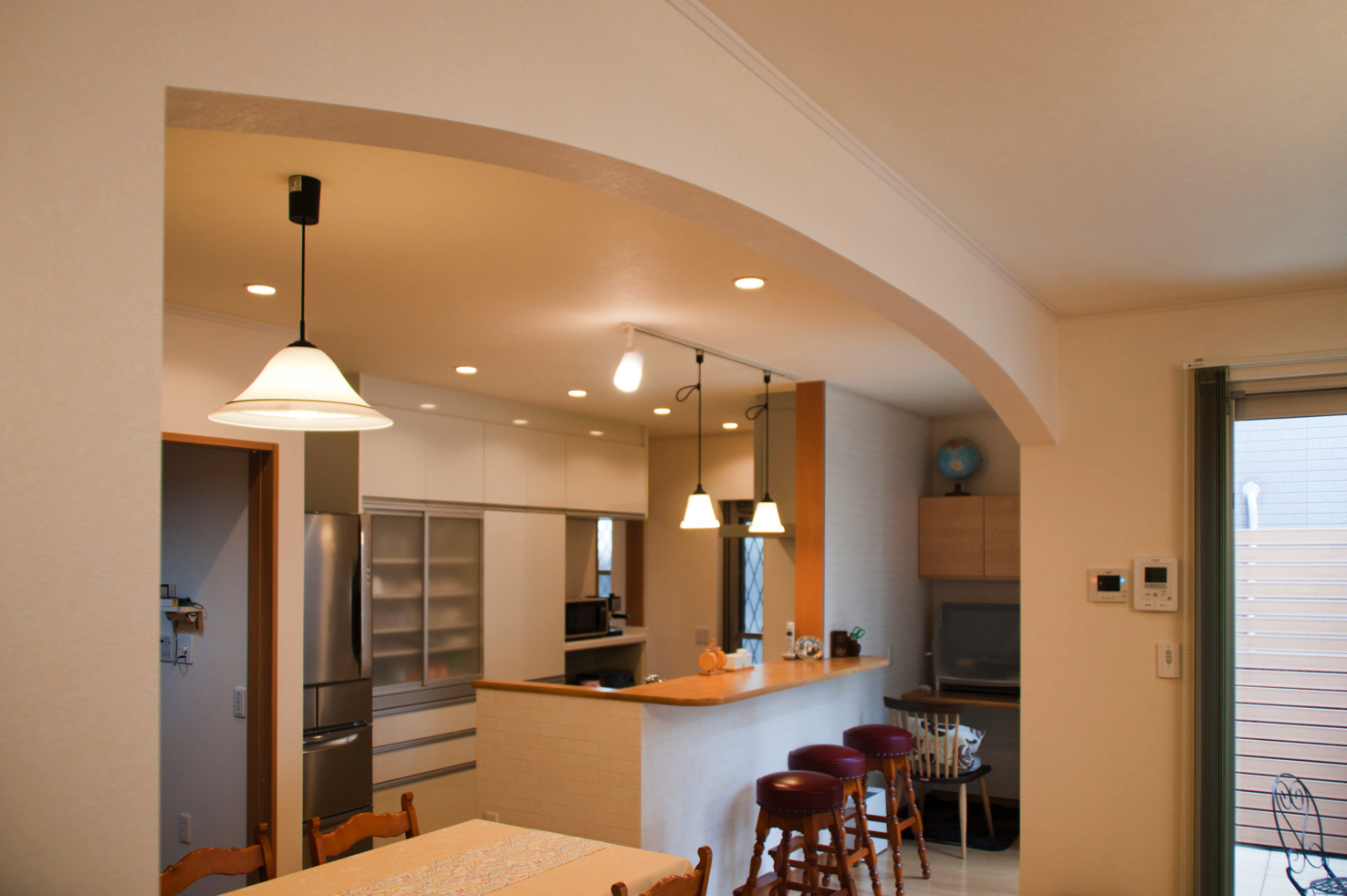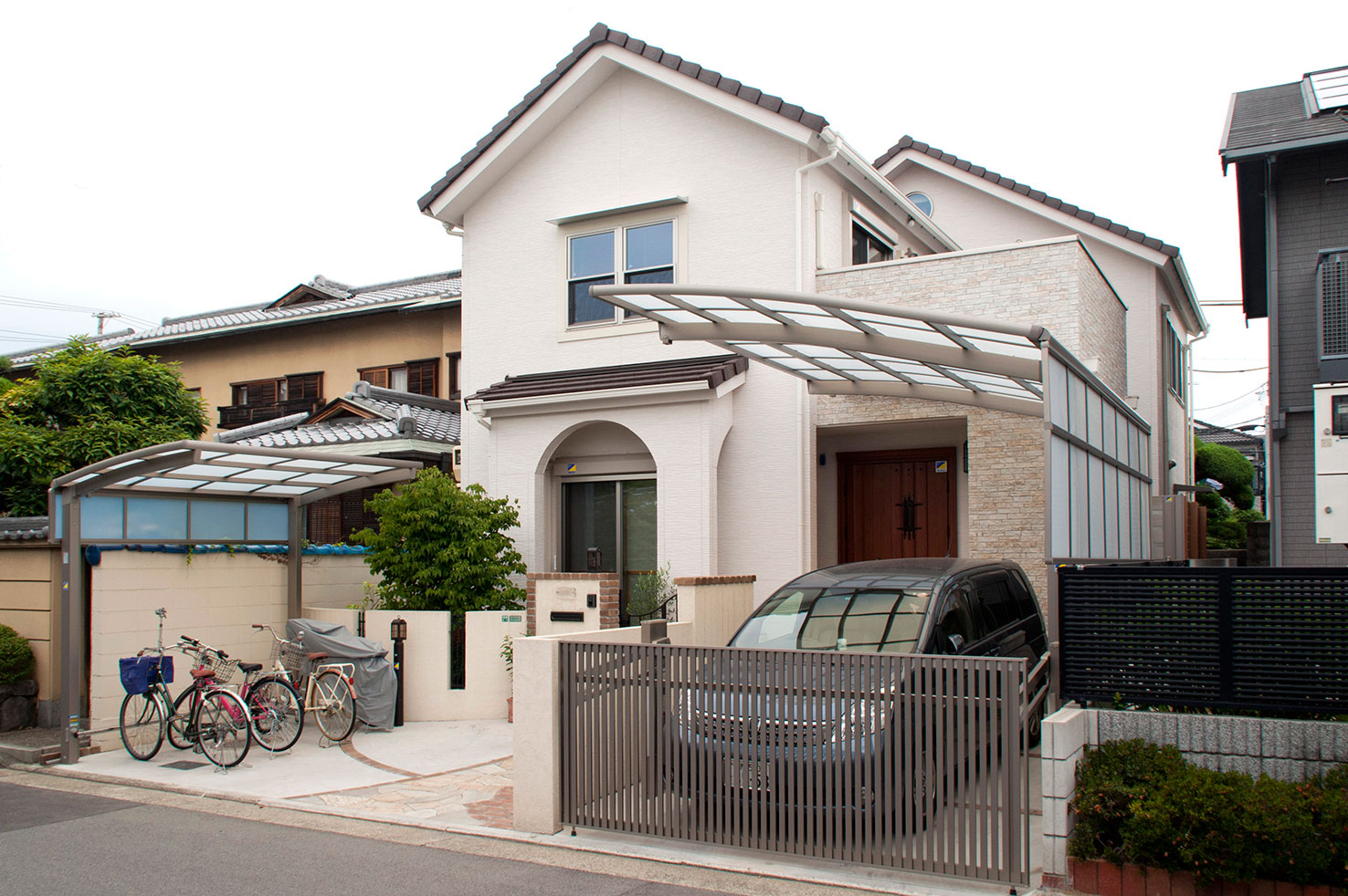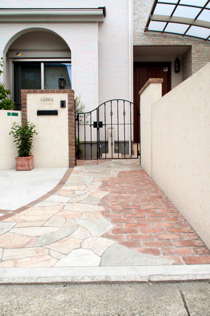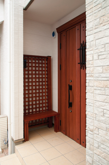K様邸の外観は窓前の白いアーチが印象的なエレガントさを感じさせる洋風スタイルです。横浜の異人館がそのモチーフになったということでした。玄関ドアの手前脇には小さな木のベンチがありましたが、なぜか心がほっとするような不思議なスペースでした。