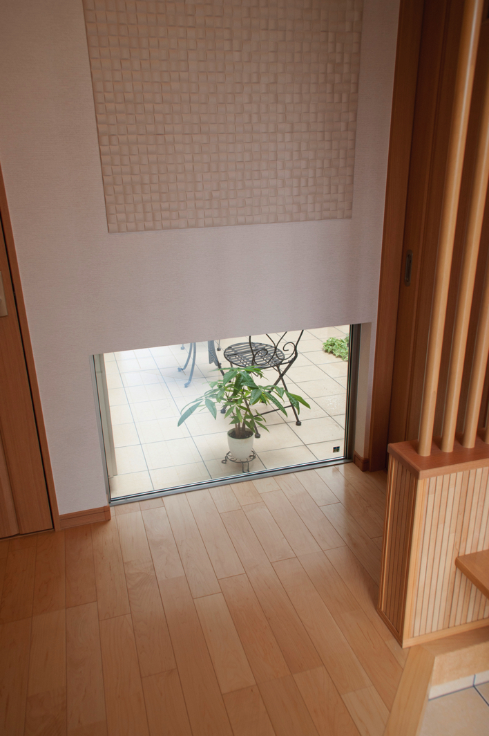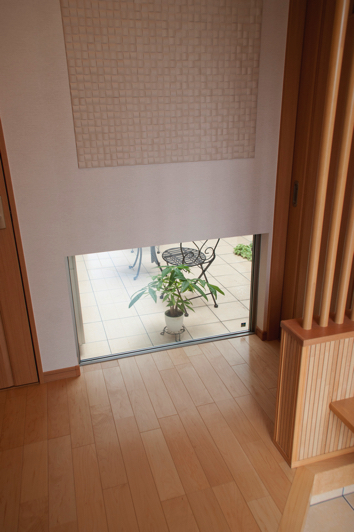 玄関ドアを開けると正面には地窓があり、そこから中庭の地面が見える設計です。一つ間違えば閉鎖的になりがちな玄関ですが、この視界が抜ける工夫により拡がりを感じるスペースになっています。