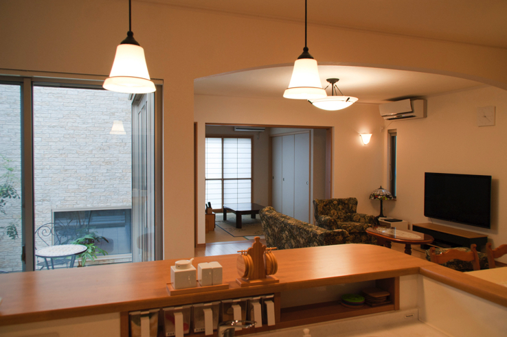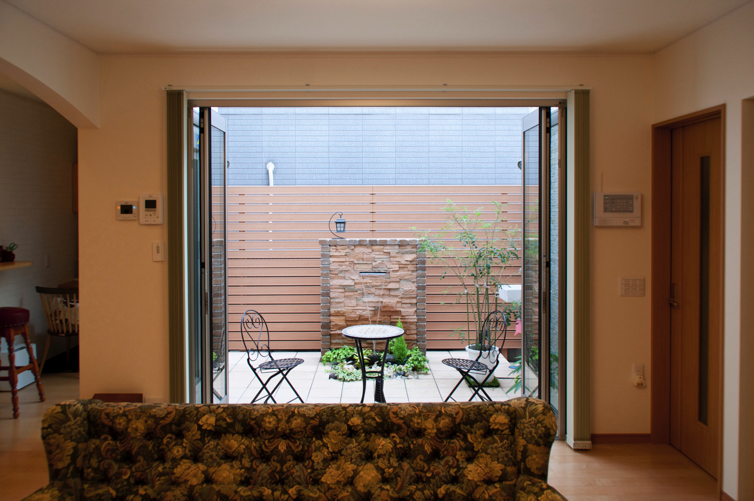 LDKのドアを開けると、そこには家の外観から受けるイメージよりはるかに広々としたスペースがありました。この拡がり感を生んでいる大きなポイントが玄関から少し見えた中庭です。その中央奥には石積みの壁から水が湧き出る噴水が設けられエレガントな時間を演出していました。室内に注ぐ光と流れるそよ風、そして緑と水の音‥この中庭は正に五感で楽しむ庭でした。さらに全開放サッシを開け室内空間と一体化してできるスペースは、物理的にも感覚的にもくらしにゆとりを生んでいました。