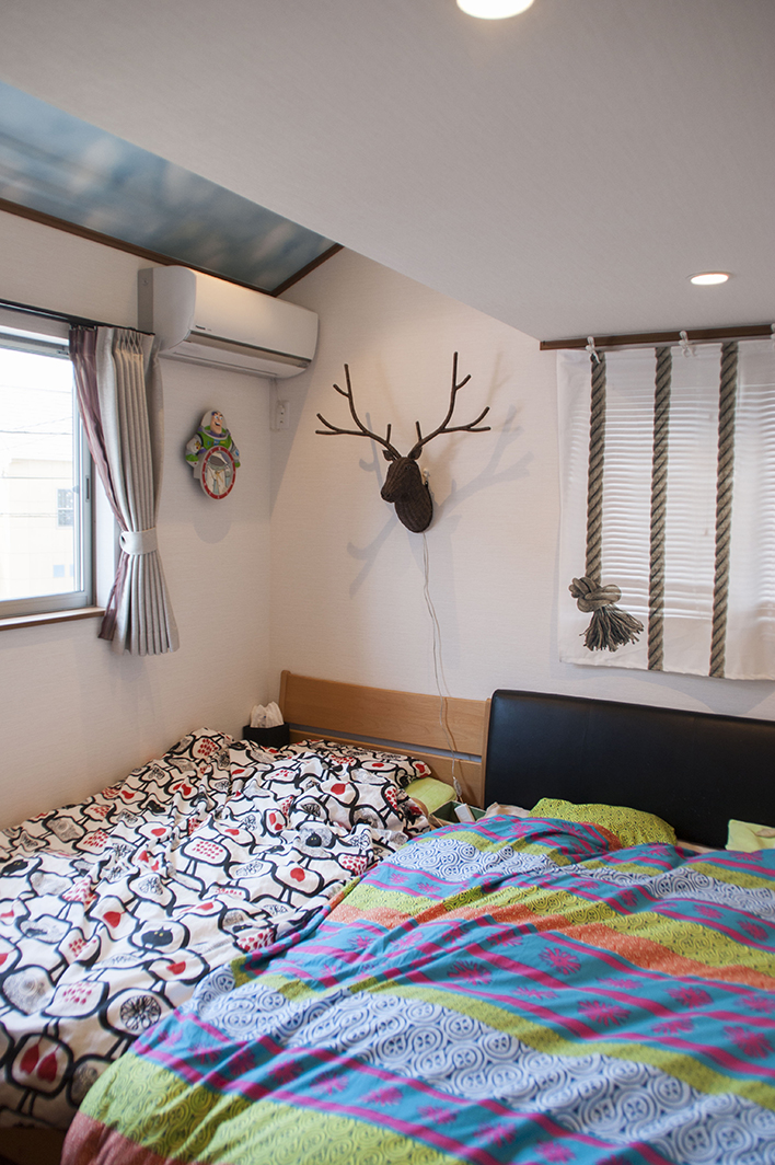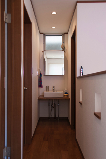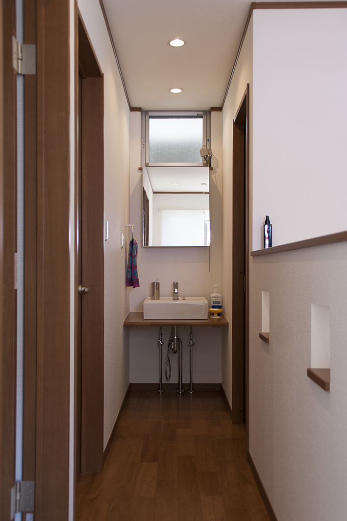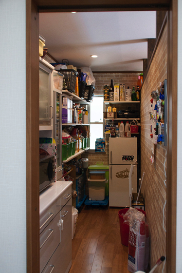 ついつい楽しい雰囲気に目をとらわれてしまうM様邸ですが、実は使いやすさもよく考えられています。キッチン脇の納戸は、食品の他一部家電も納められる大容量空間。リビングとの境の壁は上部をあえて開口にすることで、空間の広がりを確保するとともに、空気の流れも良くしています。 キッチンで納戸と反対側の引戸を開けると家事のしやすさを考慮した裏動線がつながります。洗面脱衣室に短い距離でアプローチでき、2階にもすぐに上がれるという便利さです。 さらに、2階も3室にロフトが設けられるなど、暮らしやすさが広がるゆとりのスペースが考えられています。