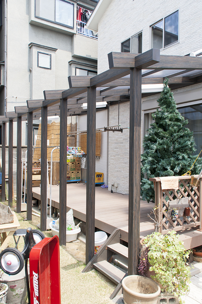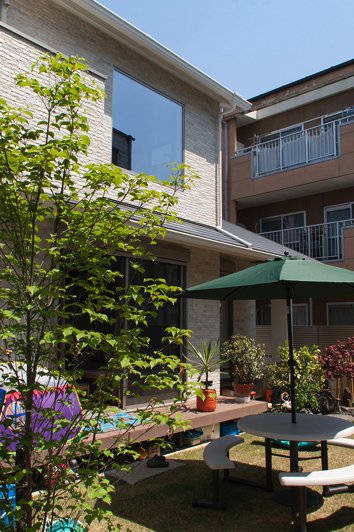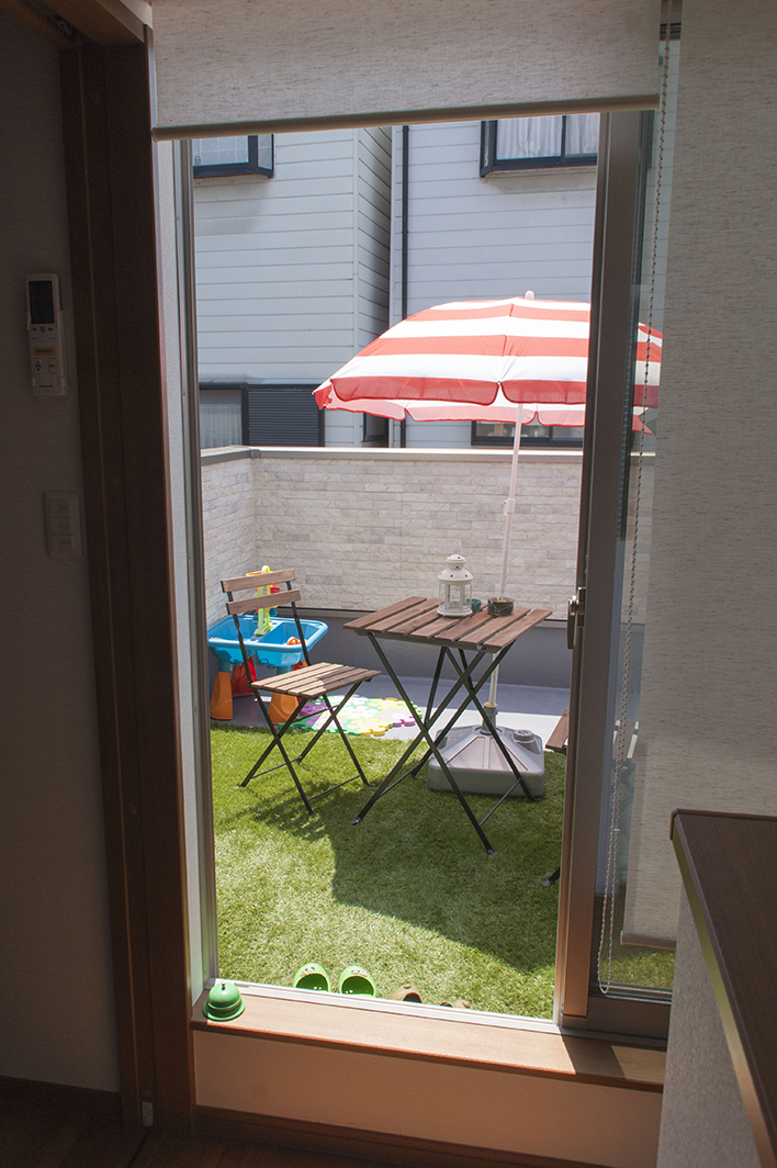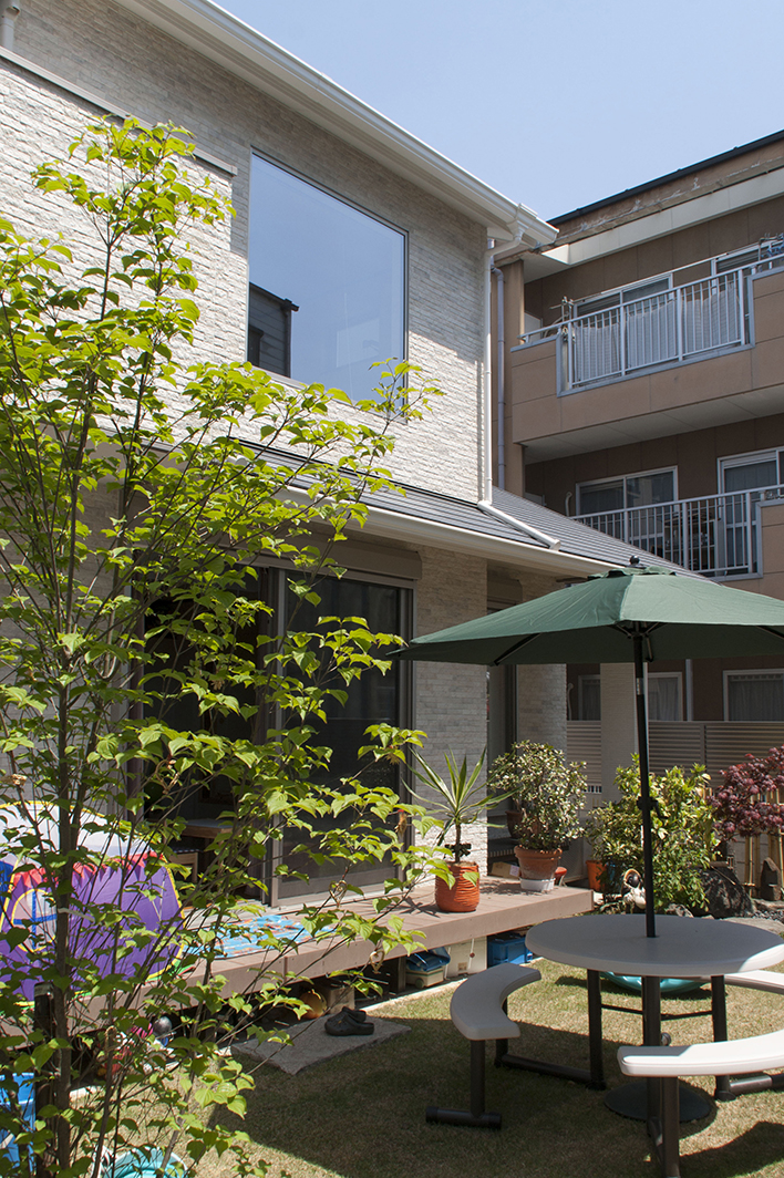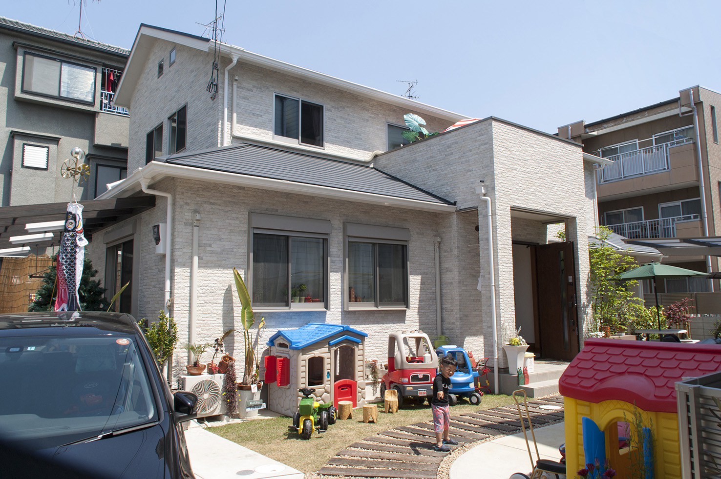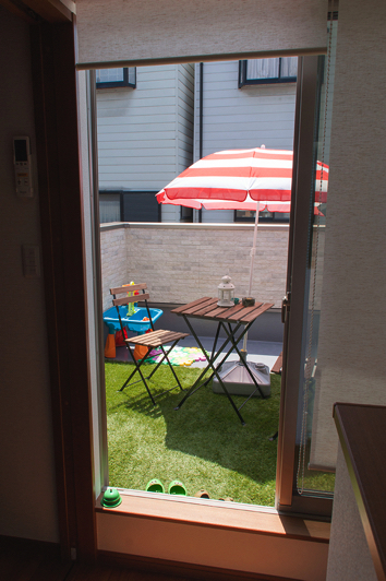 家の庭には、わんぱく盛りのお子様のおもちゃがたくさん。まるでアミューズメントパークに来たような楽しい雰囲気です。淡いベージュが基調となった外観は、遊具やパラソル、植栽、そして太陽の光とよく合い、リゾート施設のような優雅なイメージも醸し出していました。