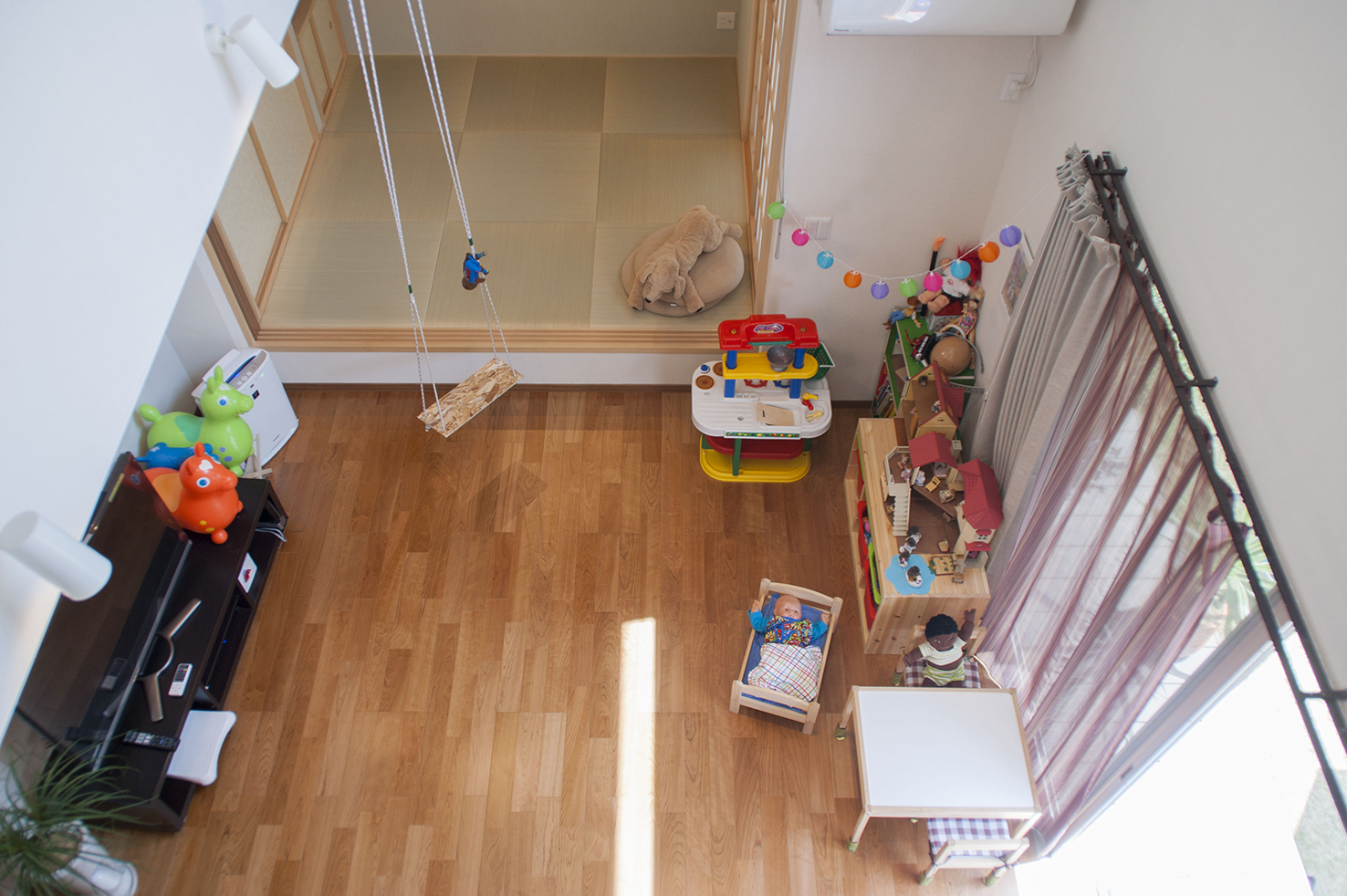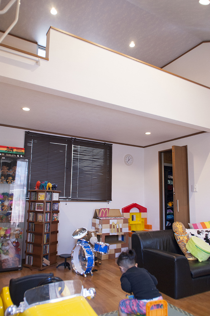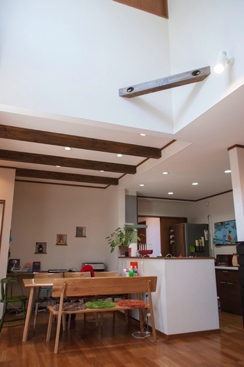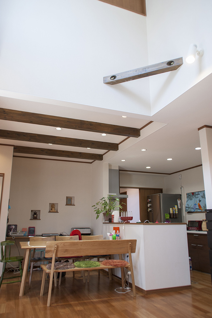 家の中にお邪魔してもその楽しさは変わりません。吹き抜けのリビングには、“火打ち”という構造材からブランコが掛けられ、お子様の遊び場に。おもちゃ以外の置物などもカラフルなトーンが多いので、内装や家具の木質感とよくマッチし楽しい雰囲気が演出されていました。 木質感と言えばダイニングスペースの天井が梁の“あらわし”になっている点もご主人お気に入りのポイント。空間に変化が生まれ、天井も高く開放的になるということがその理由でした。 また、家全体にダウンライトの多く採用した点もM様のこだわりです。アットホームなライフスタイルなのに、生活臭さが感じられない理由の一つが、この照明器具の選択にあるような気がしました。