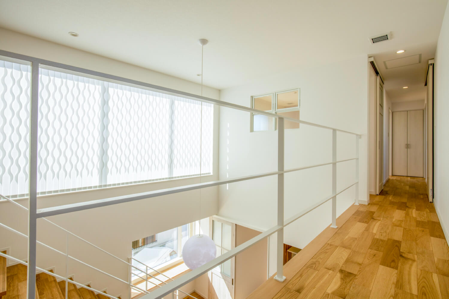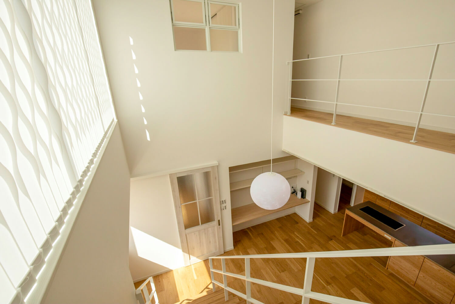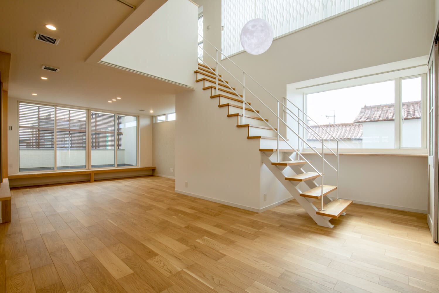 家の中心にある鉄骨造ならではの大きな吹き抜けが家の隅々まで明るく自然光を届けます。