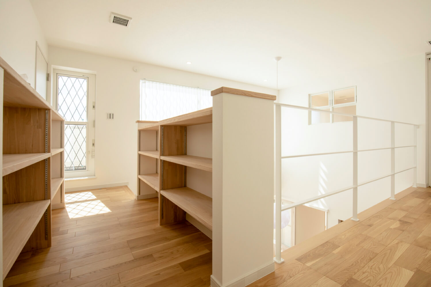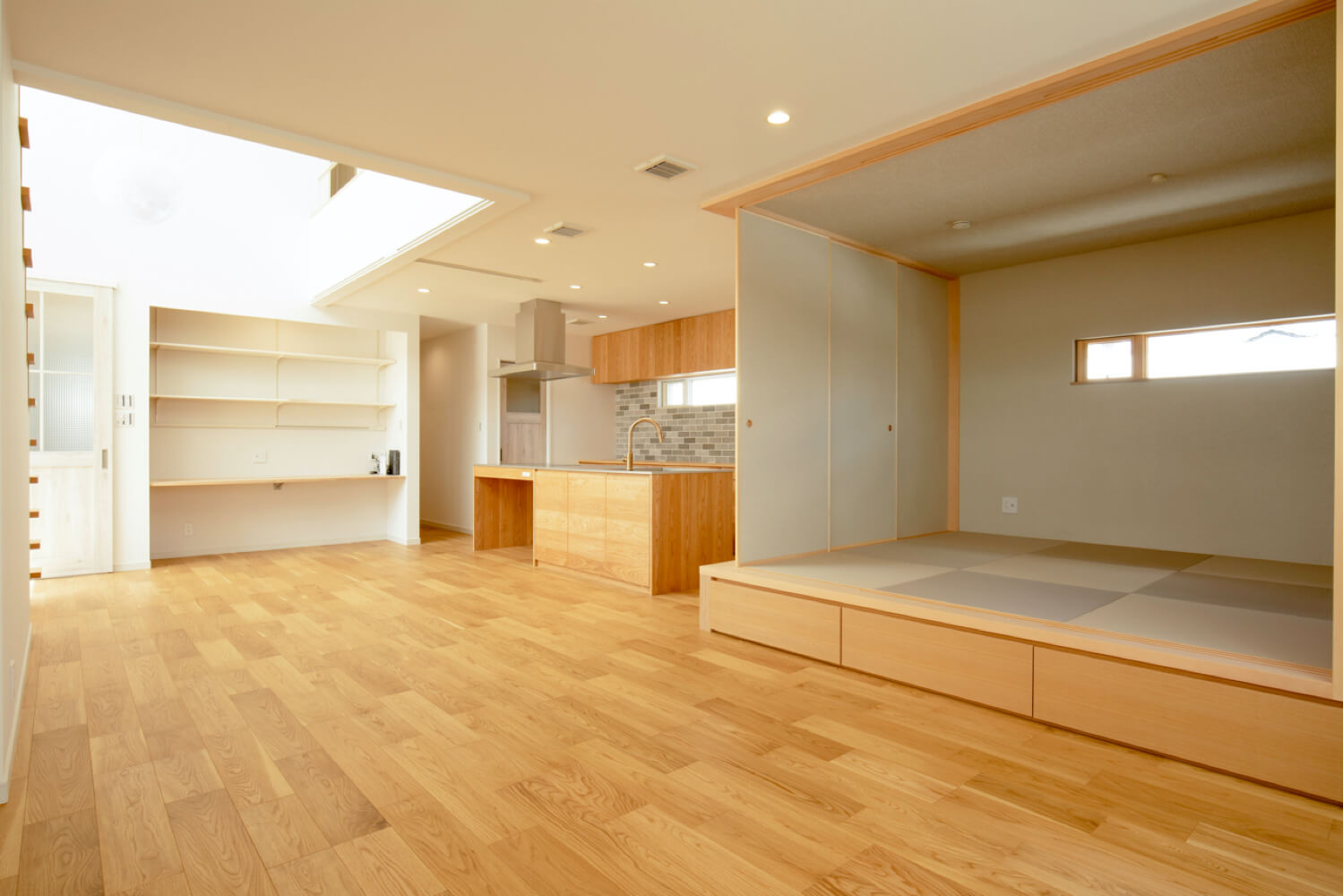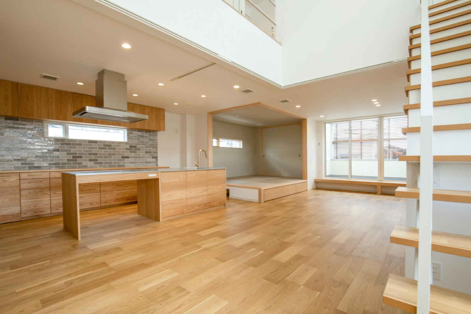 家の中心にある鉄骨造ならではの大きな吹き抜けが家の隅々まで明るく自然光を届けます。