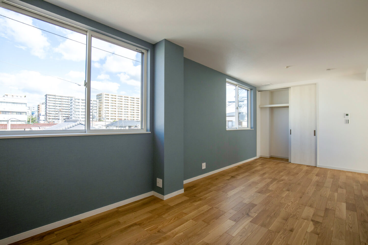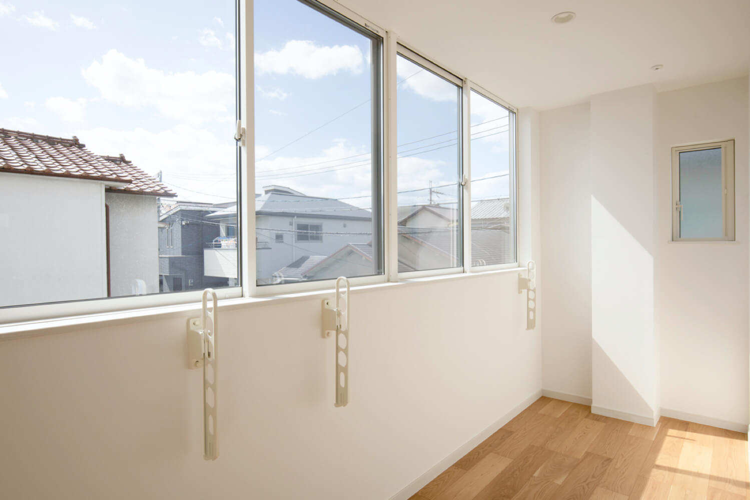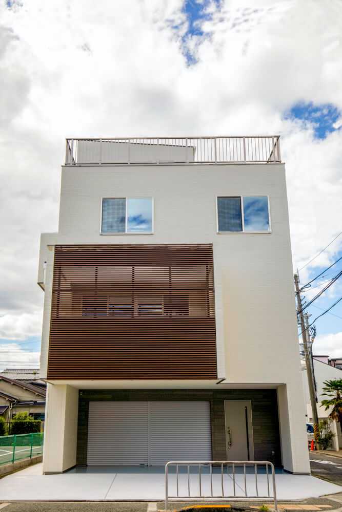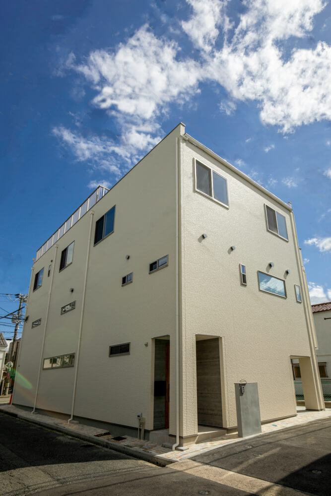 郊外の交通至便な場所に建てられたオール電化の三階建住宅。
