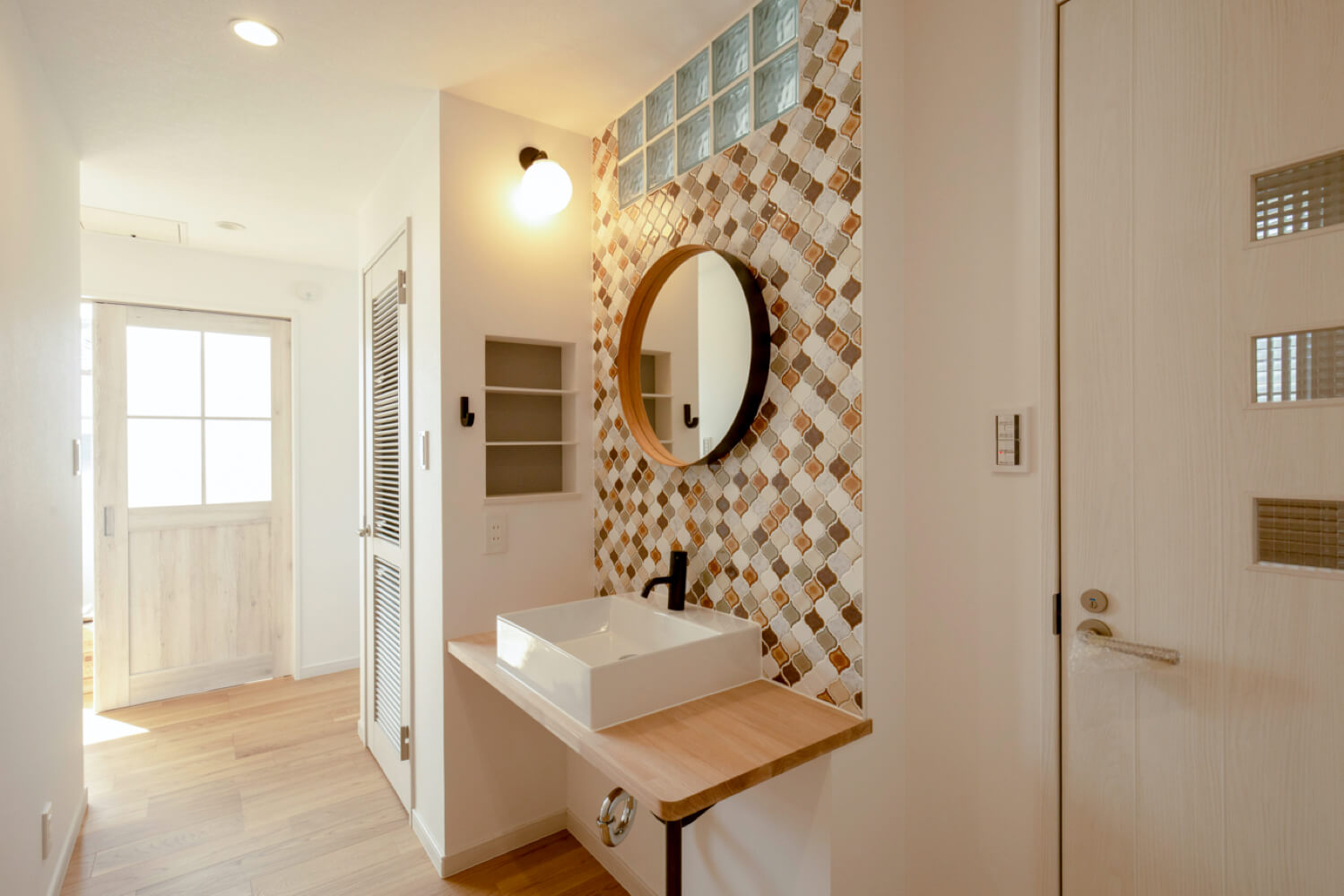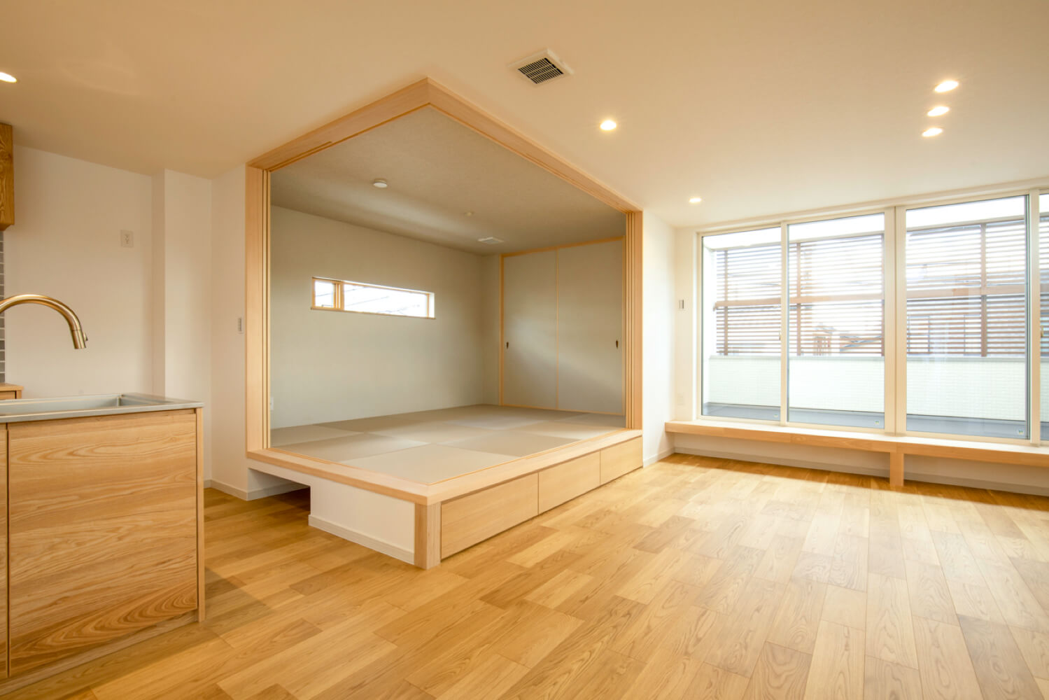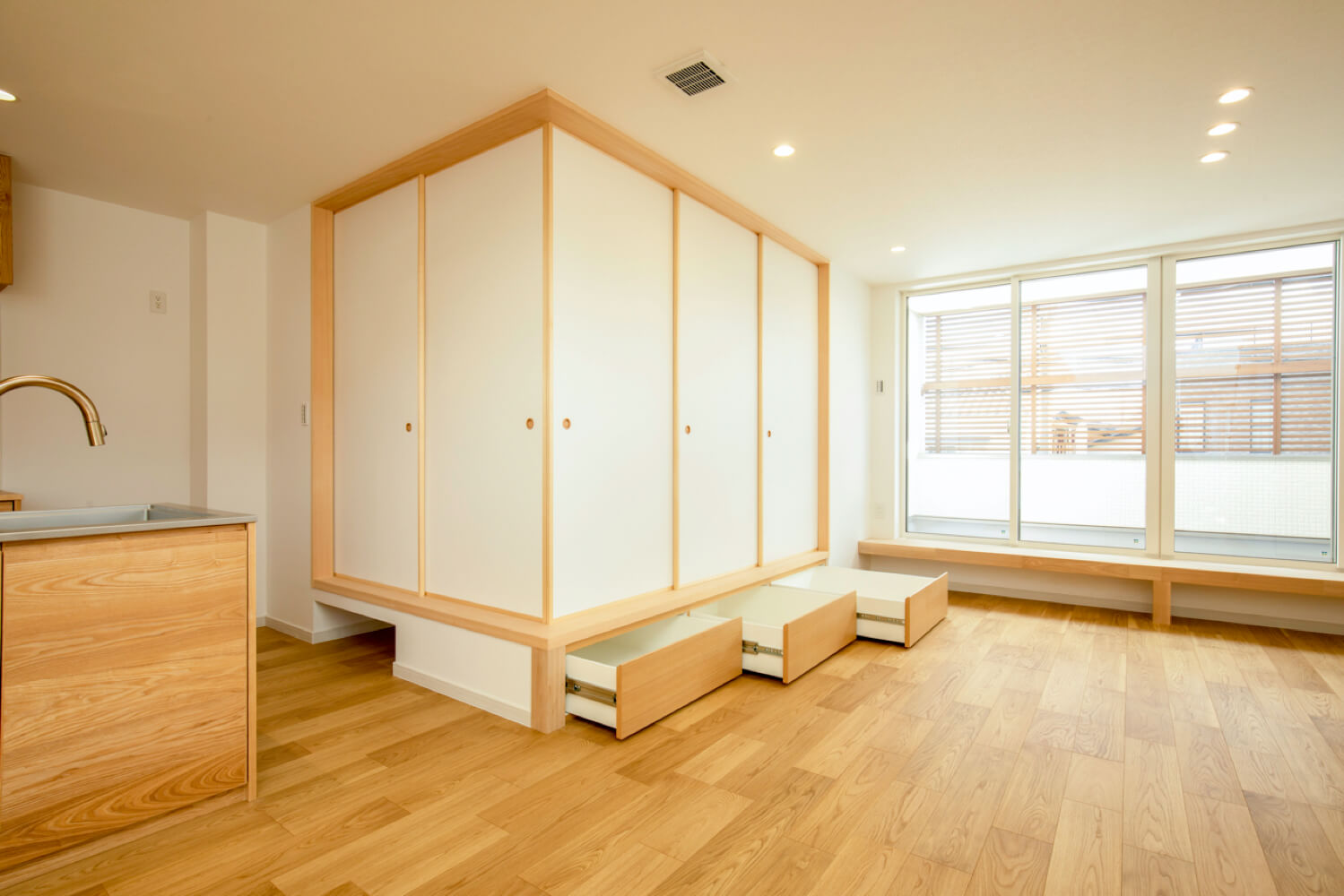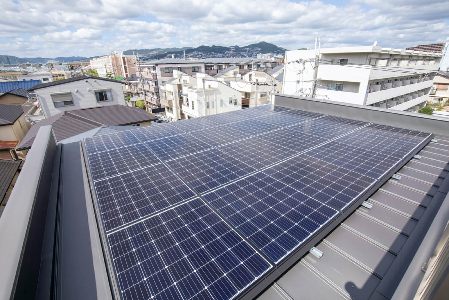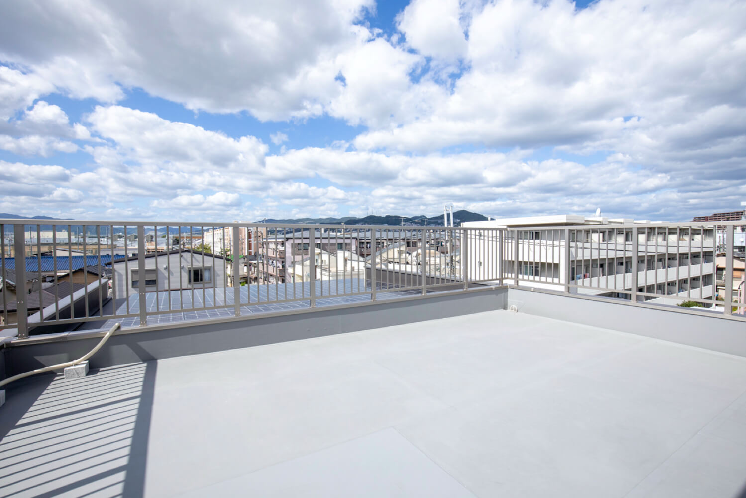 お施主様のご友人のコーディネート。見晴らしのよい屋上の一部は、太陽光発電に利用しています。