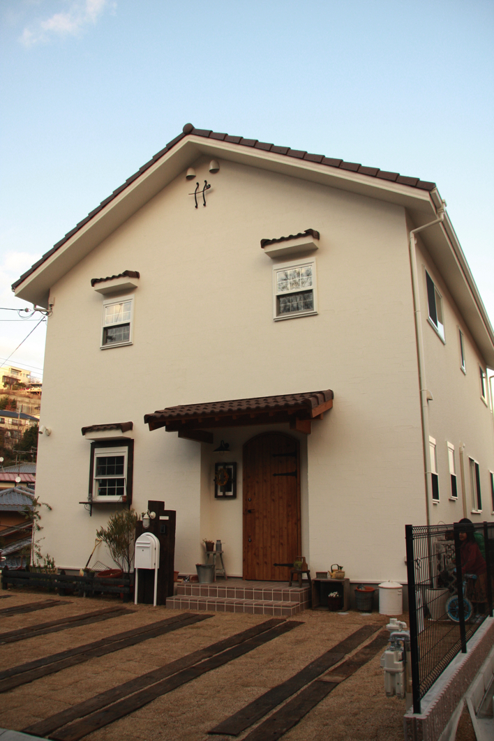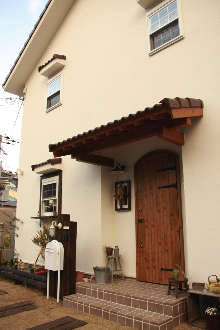 まず一見シンプルな外観ですが、カントリー調のアーチ型玄関ドアや古材風にペイントした木枠で縁取られた窓、鉄道枕木を用いたオリジナルの門柱など、奥様のこだわりが随所にちりばめられ、ガーデニングと相まって独特なフォークロアな雰囲気を演出しています。