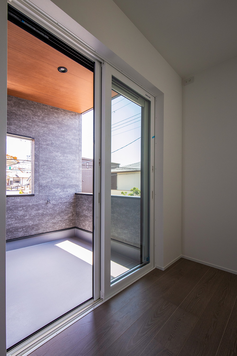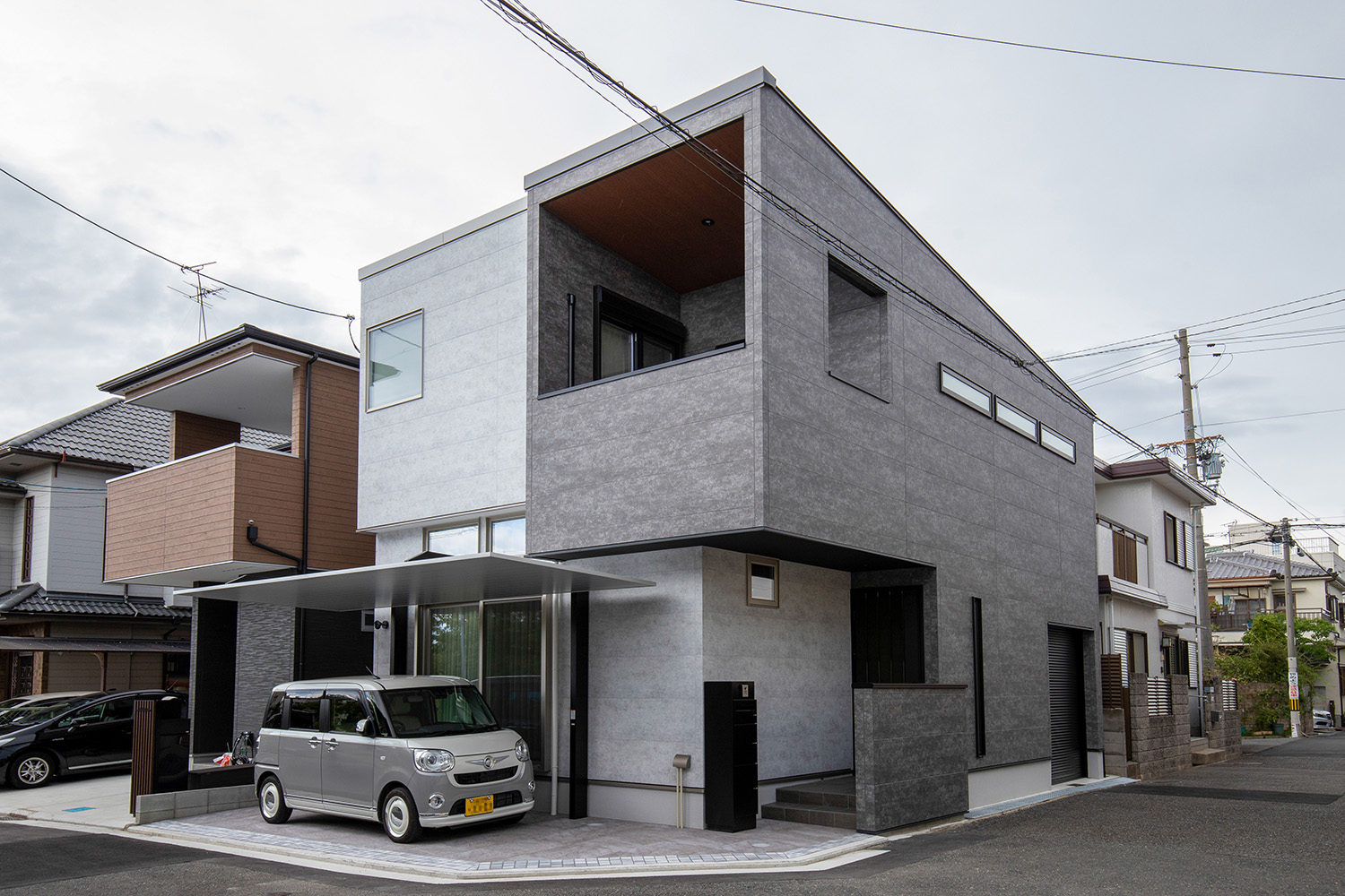 道路に面してゆったりとした駐車スペースを設けることができました。南側リビングの天井を吹抜け風にして、