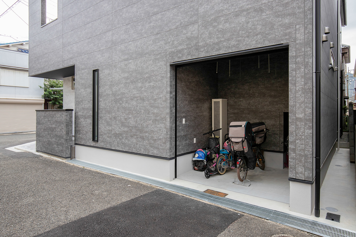 建築士のアイデアで敷地北側にバイク専用のビルトインガレージを設けることになりました。
