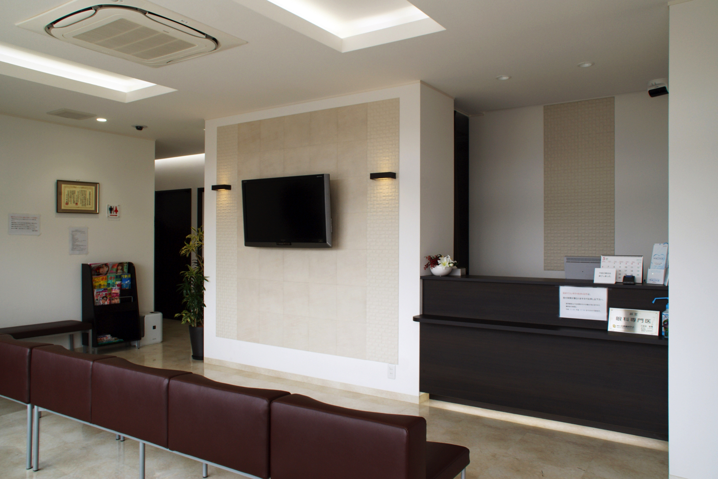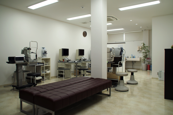 伊丹市の眼科新築工事です。診療所の機能を考慮してプランニングを行うとともに、大きな窓や調湿効果のある内装材、間接照明などによって快適性の高い空間を実現しています。また、太陽光発電システムを採用することで省エネにも配慮しました。