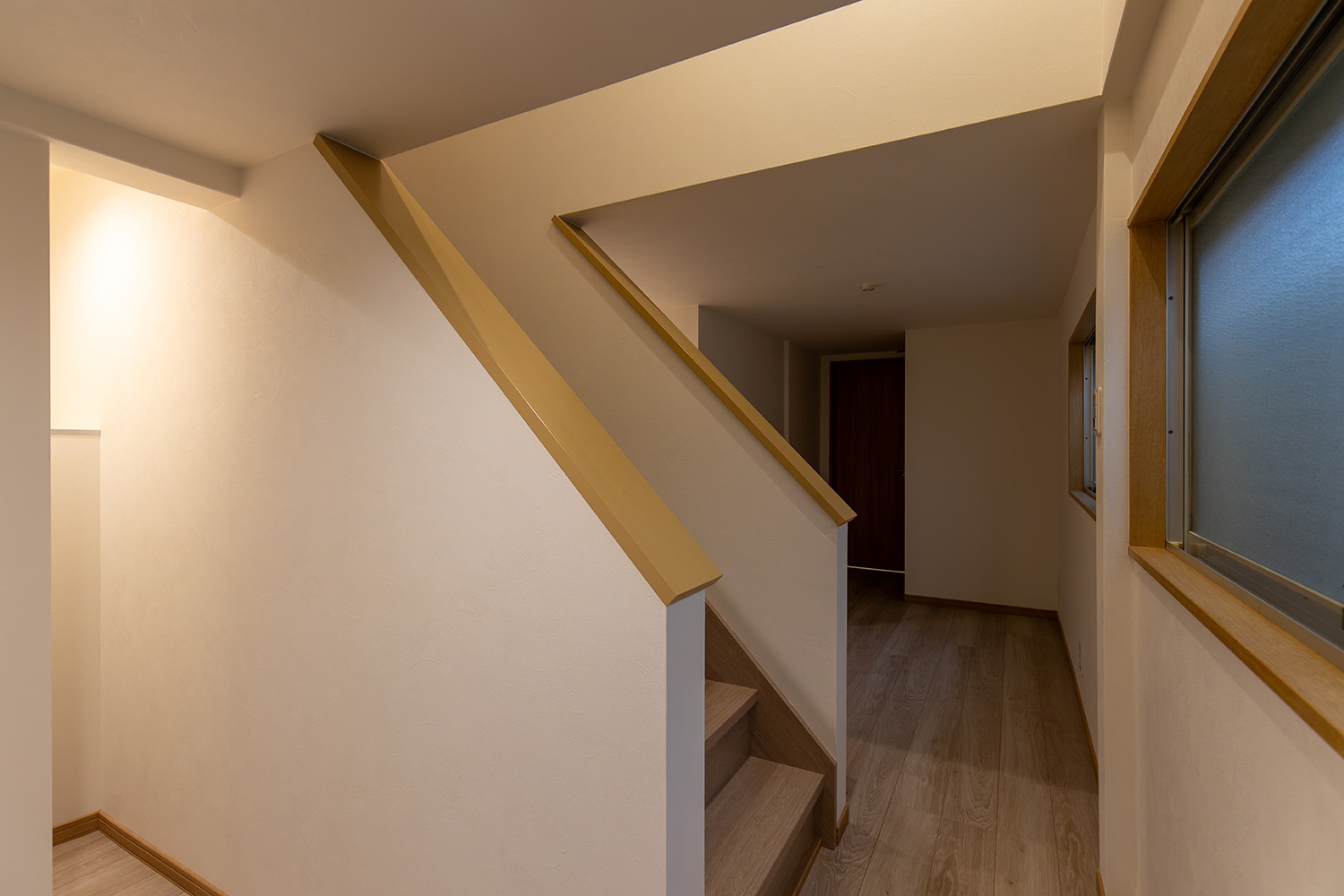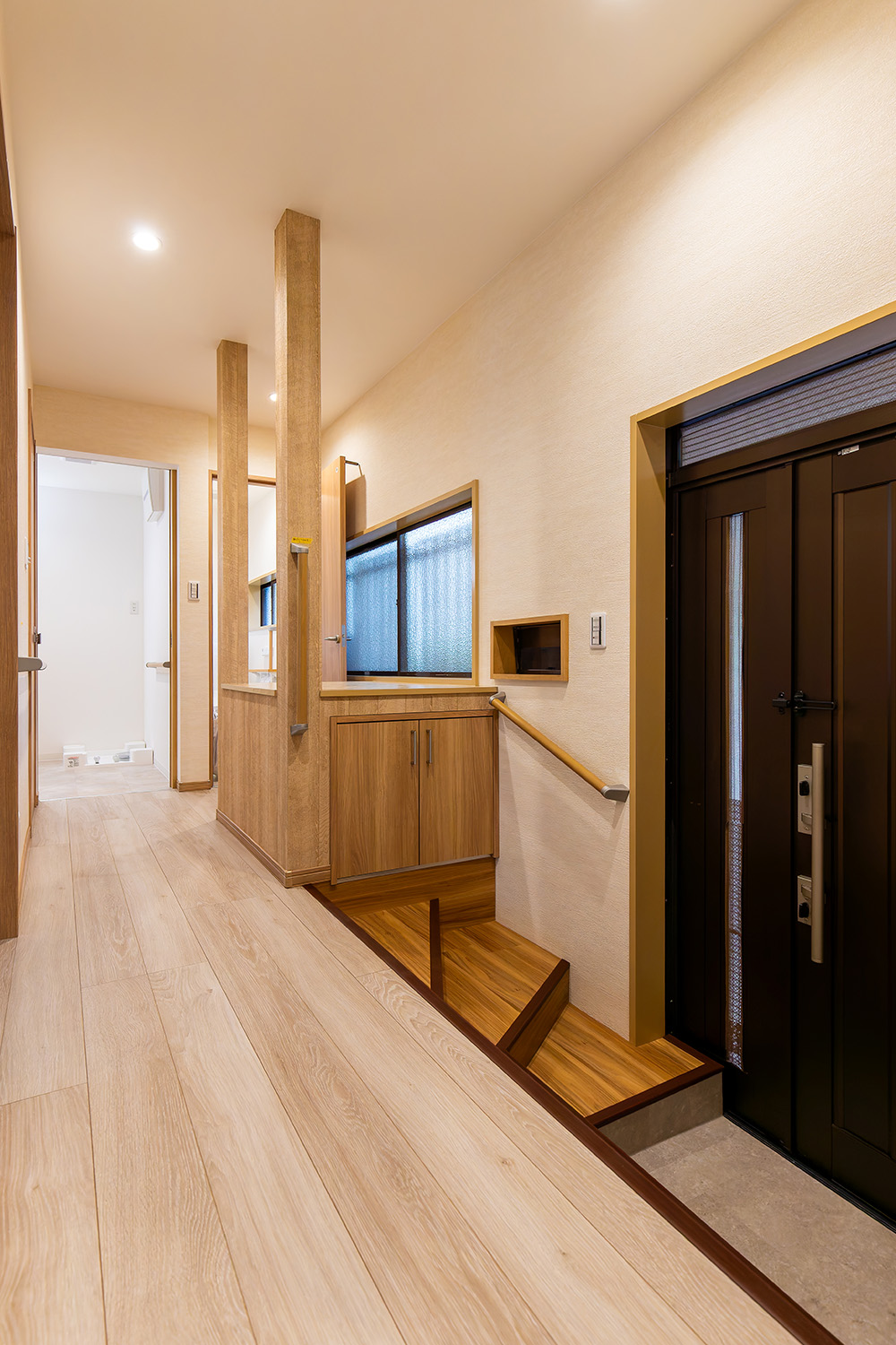 玄関スペースです。廊下の床面を下げたかったのですが、浴室、キッチン、トイレの排水管勾配確保のためにどうしても下げられず、