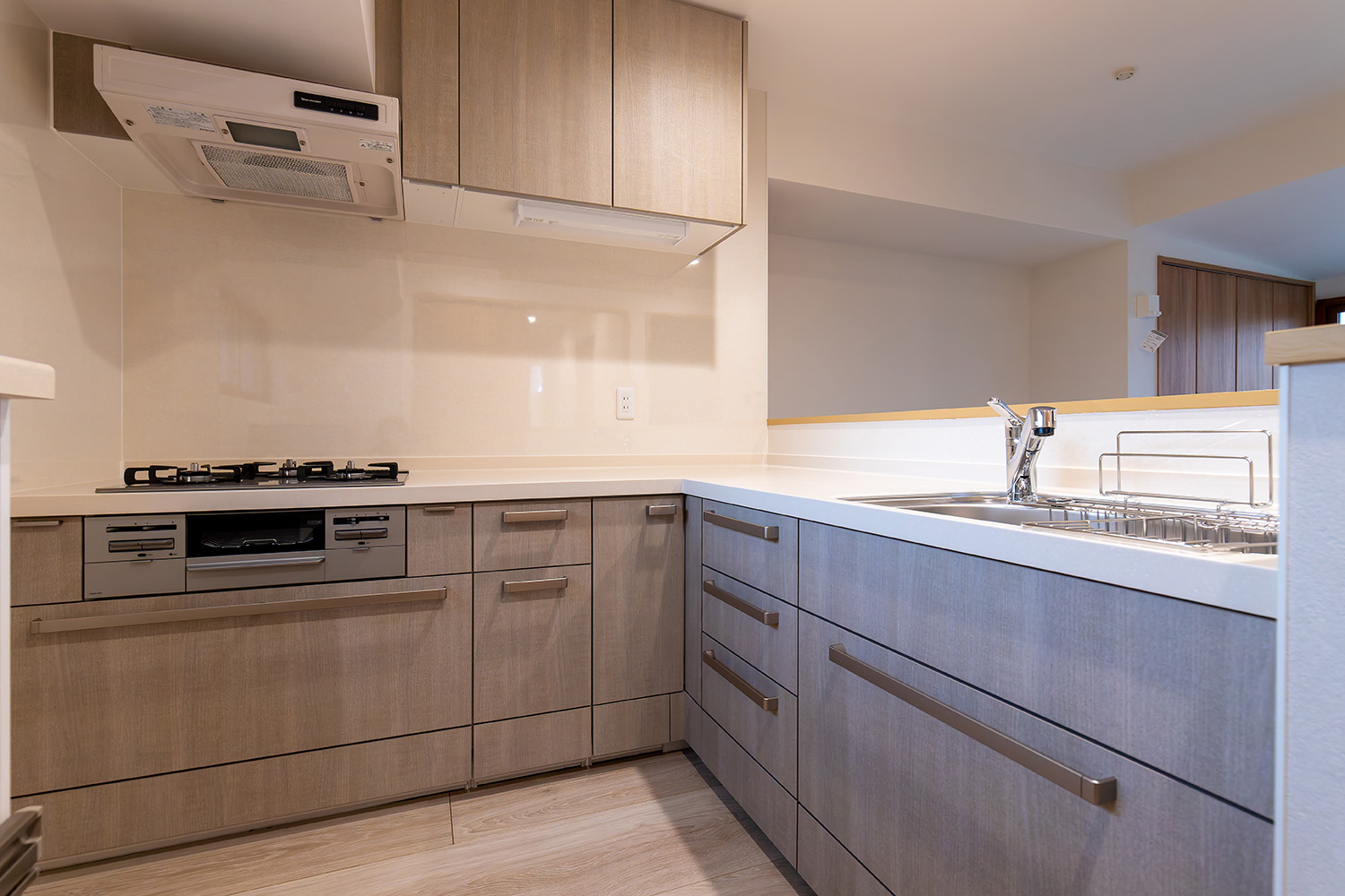 L型キッチンです。収納量を多く、動線を短く、家事楽の発想で提案しました。