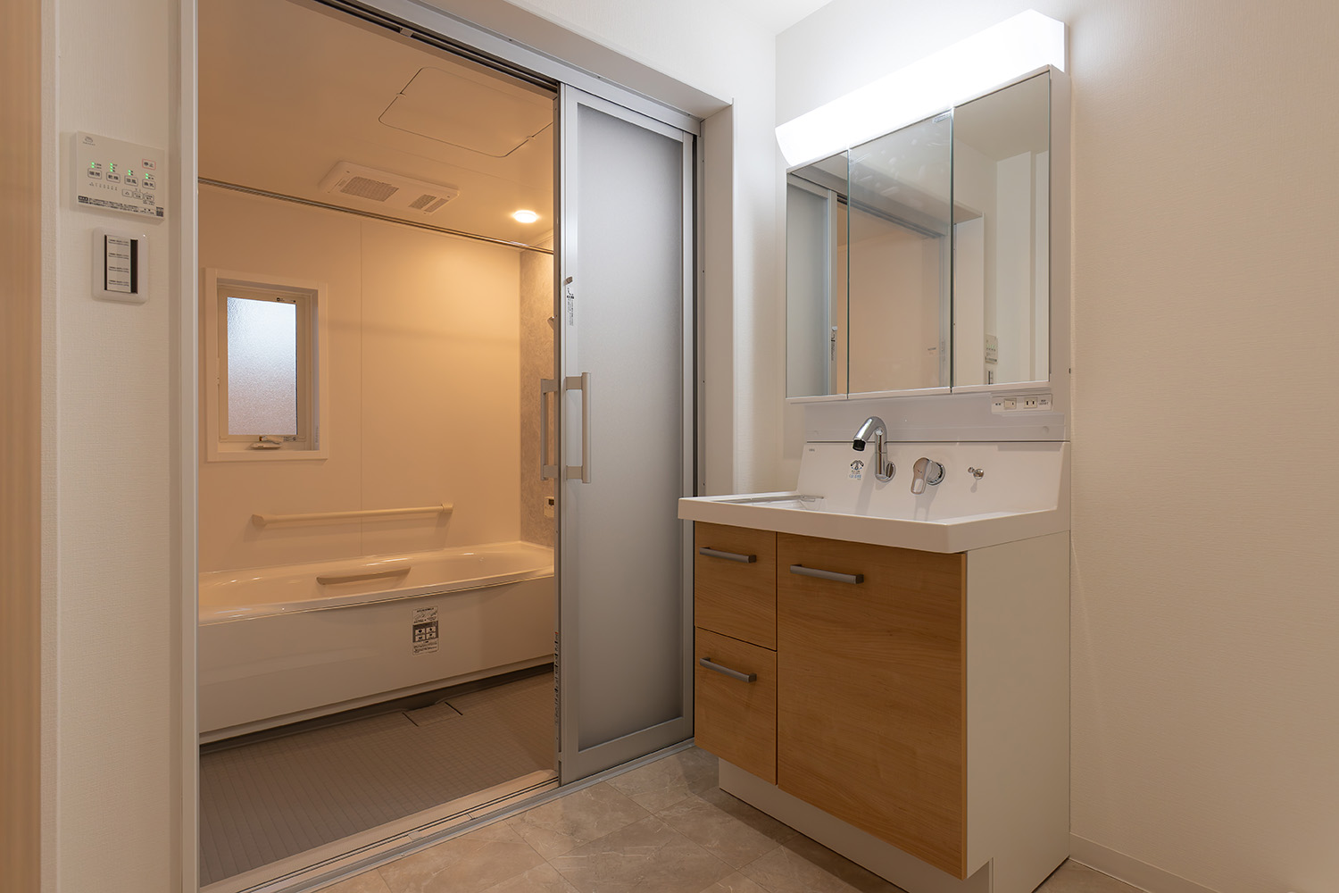 将来の介助等の観点から浴室は開口を広くとれる3枚引戸にし、洗面スペースも広めに確保しました。