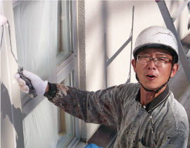 塗装とは、ペンキで家をきれいに塗る仕事。今は家をお化粧していますが、昔は化粧品会社に勤め女性の顔をお化粧したこともあるんですよ(笑)仕事をしていて、色がバッチリ決まった時は快感!お客様が笑顔になることを第一に考え、見えない部分までしっかりと気を配り仕事をしています。将来、一人娘がパティシエ(お菓子の職人)になった時、そのお店をデザインして塗装するのが夢です。
