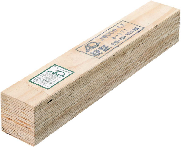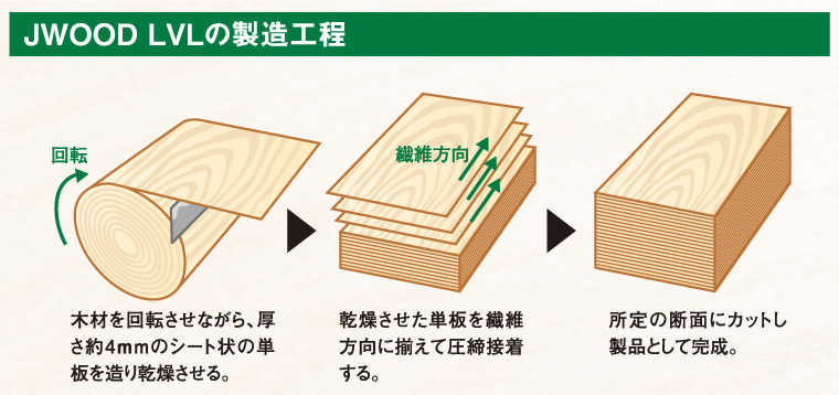 ニュージーランドの大地で植林されたパイン材の丸太を大根のかつら剥きの要領で切削し、ドライヤーでしっかり乾燥。その厚さ4mmの単板を、繊維方向を揃えて圧締接着した構造材がJWOOD LVLです。内部までしっかり乾燥させているので長期的な寸法安定性を実現し、無垢の構造材などに比べてばらつきの少ない安定した強度を発揮します。 LWOOD工法では柱や梁、筋交い、壁合板などの構造材に、このJWOOD LVLを使用しています。