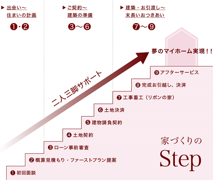 ご予算の管理はもちろん、土地診断、ローン計画、登記手続き、税務申告など、難解で面倒な手続きも最初から最後までトータルにサポートし、その安心の上に夢のマイホームを実現させます。
